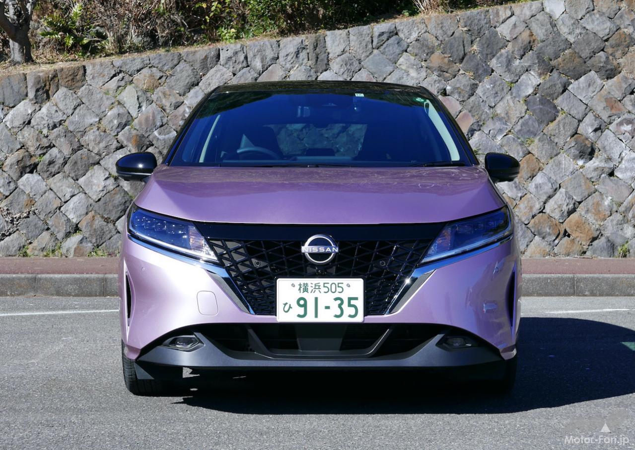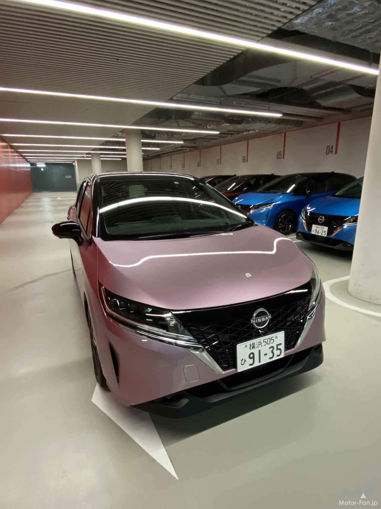 というわけで、日産本社地下1階で対面したオペラモーヴ/ブラック(2トーン)のボディカラーのノートは、想像通り好印象だった。アリア(早く発売してほしい)とノートから始まった日産の「タイムレス・ジャパニーズ・フューチャリズム」デザインは、前から見ても横から見ても後ろから見ても新しさを感じさせてくれる。