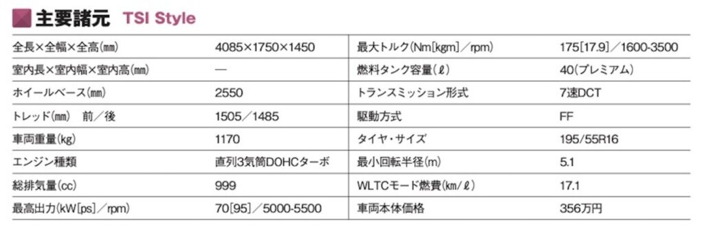 エンジンの主力は、1.0ℓ直列3気筒ターボ。ゴルフの1.0ℓターボに比べると、マイルドハイブリッドが装着されず低回転域の駆動力も下がるが、1.6ℓ自然吸気に相当する動力性能を確保する。ATも7速だから、高回転域を保った走りも行なえる。またVWらしく高速道路の直進安定性は良好だ。乗り心地は、40㎞/h以下では細かなデコボコを伝えやすいが、高速になると快適性も高まる。