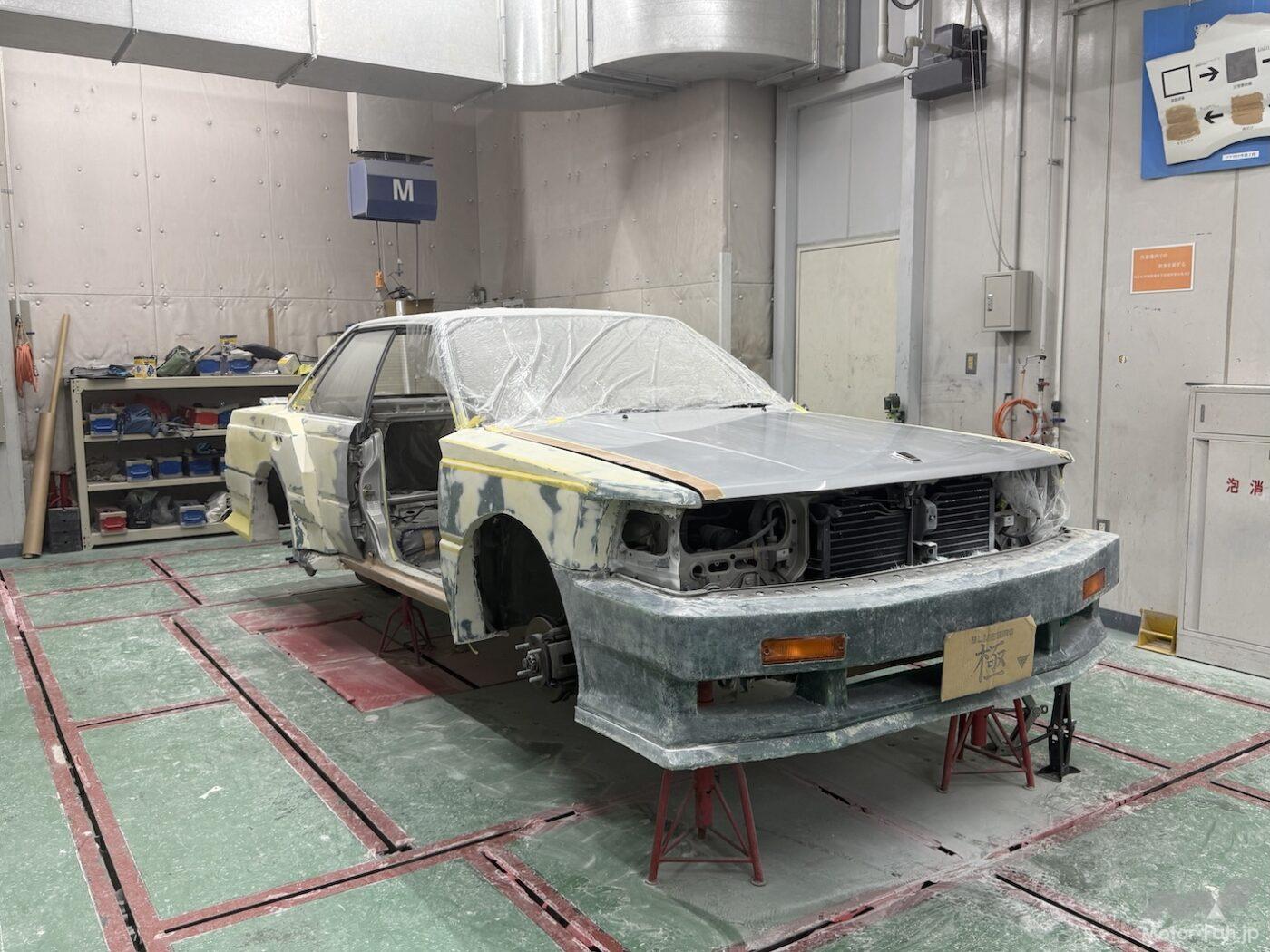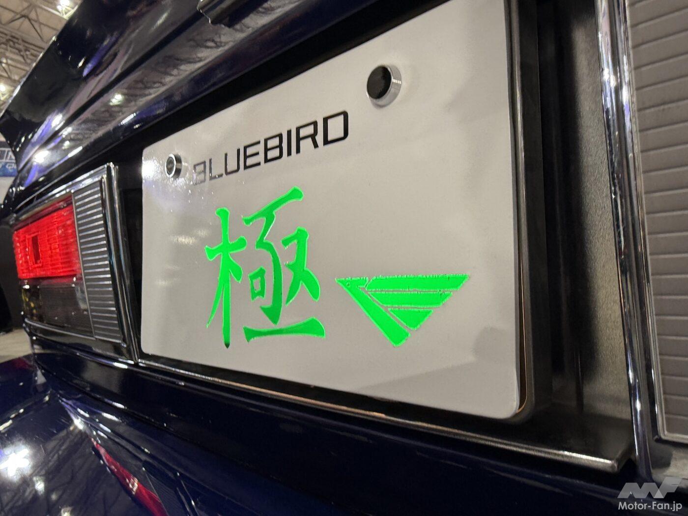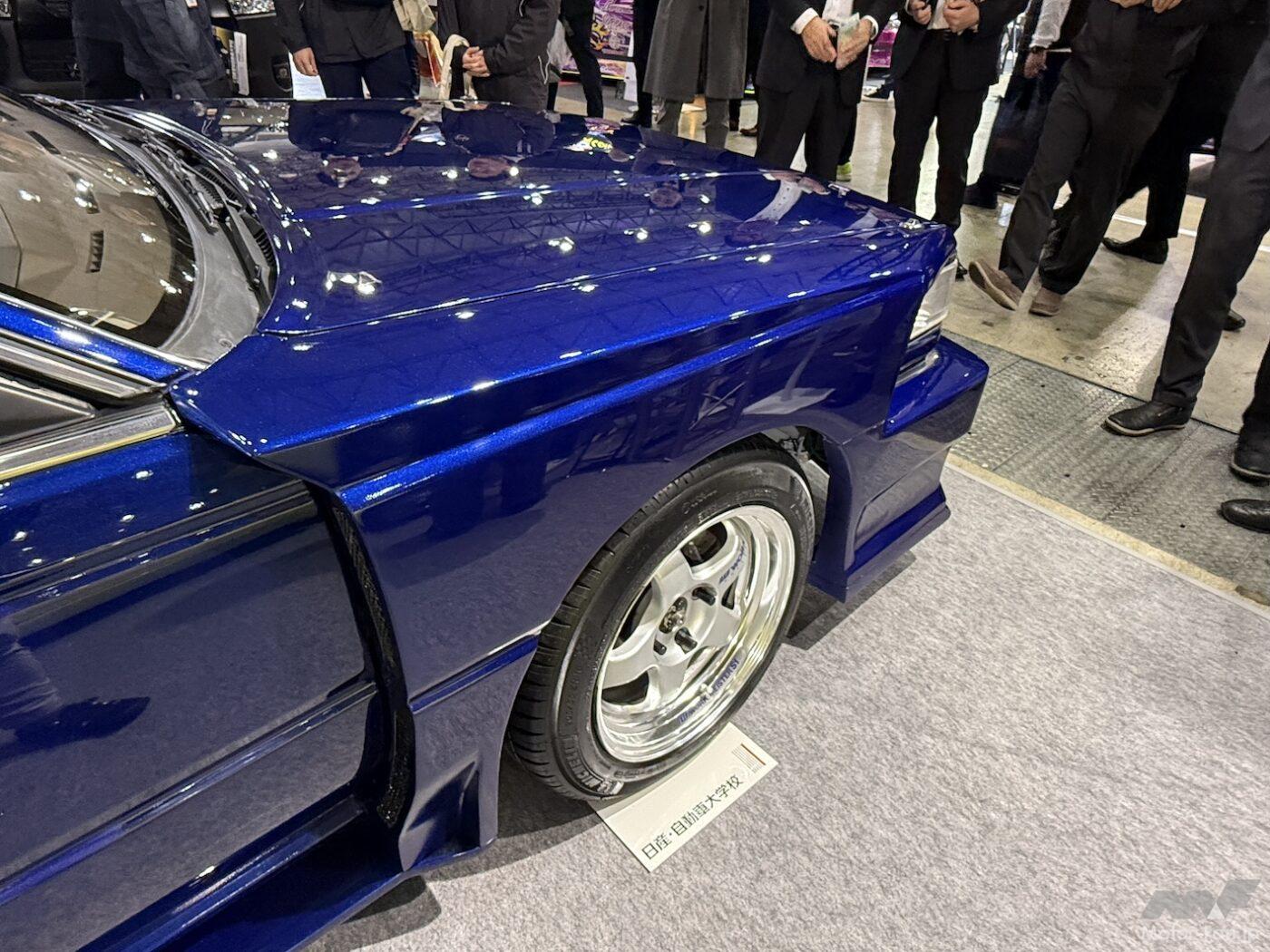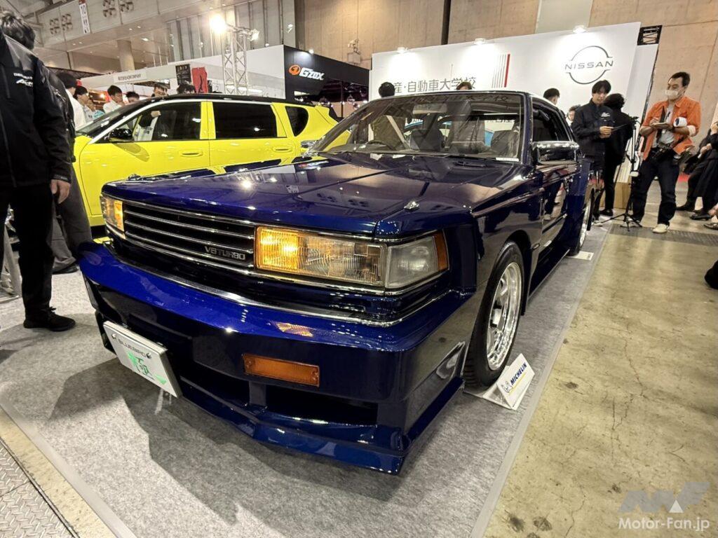 まずは、日産愛知自動車学校の自動車整備・カーボディーマスター科の3年生が制作した「ブルーバード・極」。ベース車両は36年前のPU11型ブルーバードの最上級モデル「ブルーバードマキシマ」である。マキシマといえば、V6エンジン(VG20E型)をフロントに横置きしたラグジュアリーセダンだ。当時流行したセンターピラーレスの4ドアハードトップである。