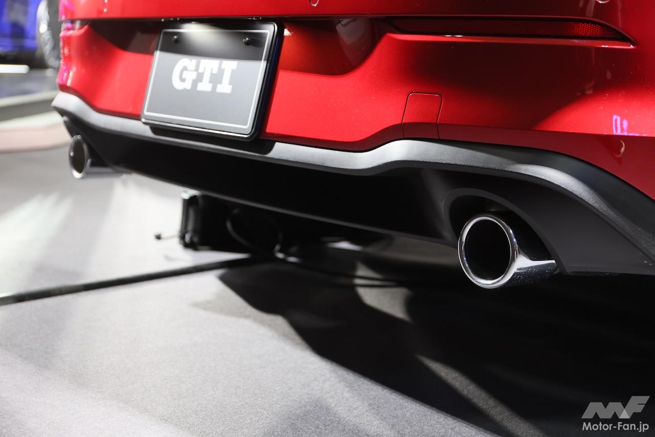 エクステリアは、GTIとひと目で分かるハニカムグリルをはじめ、大型フロントスポイラー、ディフューザー付リヤバンパー、ルーフと一体感のあるリヤスポイラーなどが用意され、ゴルフ8.5の特徴であるイルミネーション付きVWエンブレムも目を惹く。リヤビューは、ダイナミックターンインジケーター付LEDテールランプやクロームツインエキゾーストパイプにより先進的かつスポーティなムードを放っている。
