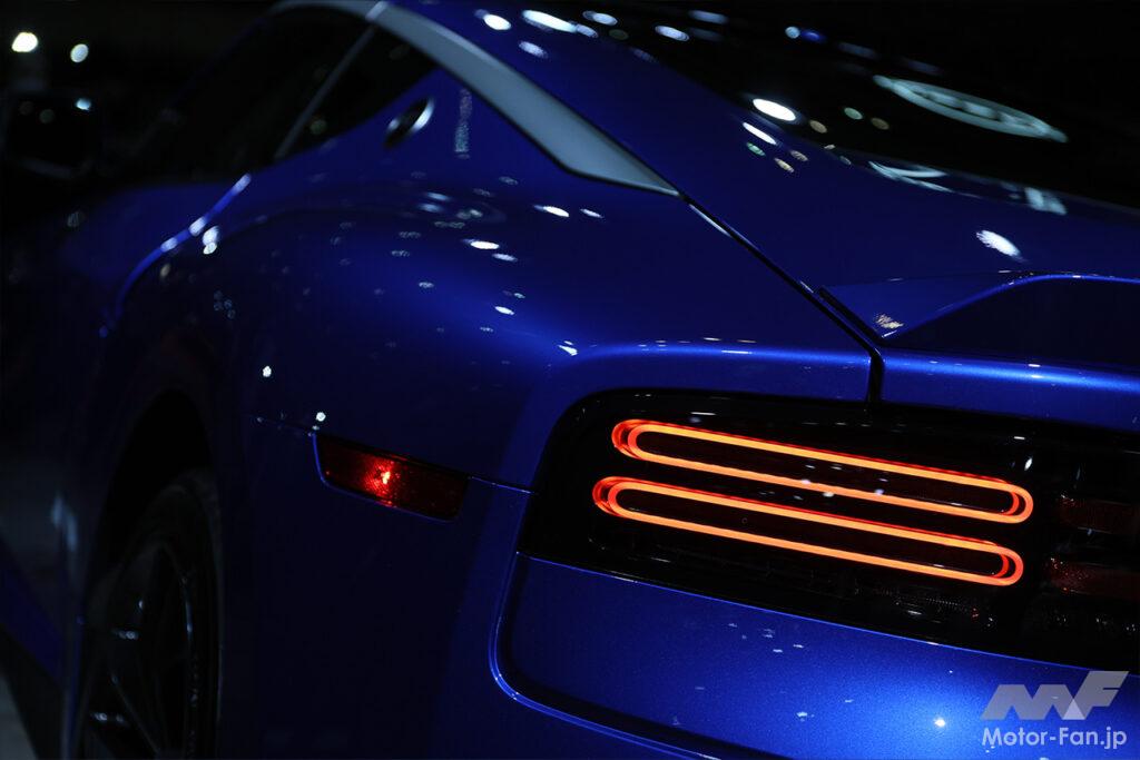 RZ34では、今なおZオーナーの6割以上が一番好きという初代S30型から続いている、そうした歴代フェアレディZの流麗なシルエットを色濃く継承。さらに、ヘッドランプではS30型「240ZG」などに装着されていたレンズカバーへの光の映り込みをイメージしたデイライト、リヤコンビランプでは4代目Z32型のダブルリングを、「オマージュ感たっぷりに作り込んだ」(田村さん)。