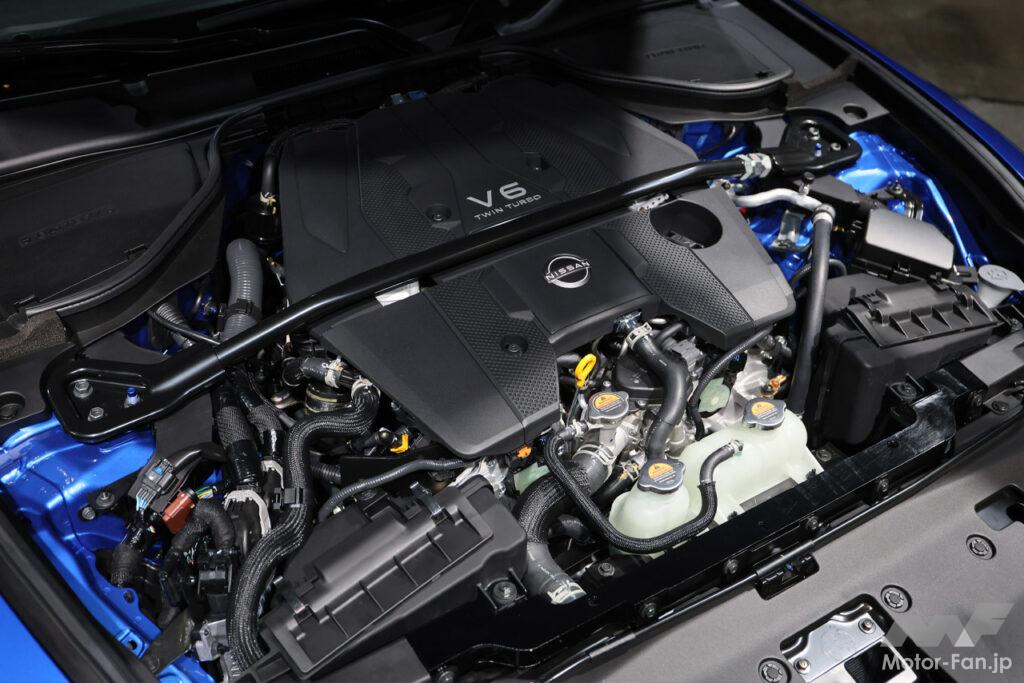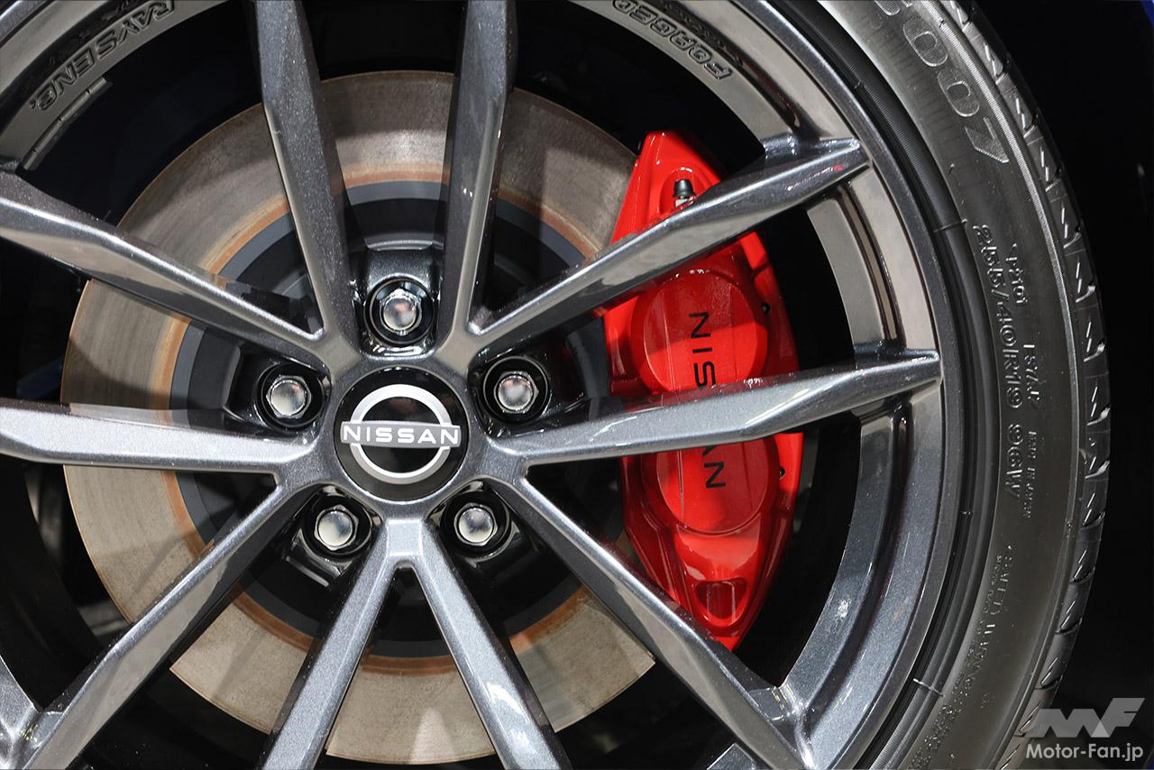 フェアレディZ NISMOは専用チューニングによって、エンジンの最高出力を基準車から+15PSの420PSに、最大トルクを+45Nmの520Nmまでスープアップ。さらに9速ATは変速レスポンスと耐久性の向上が図られたほか、ステアリングとボディのねじり剛性アップ、「トラクション」モードの新設定、専用ブレーキシステムの採用などにより、本格的なスポーツ走行に応えるポテンシャルが与えられている。