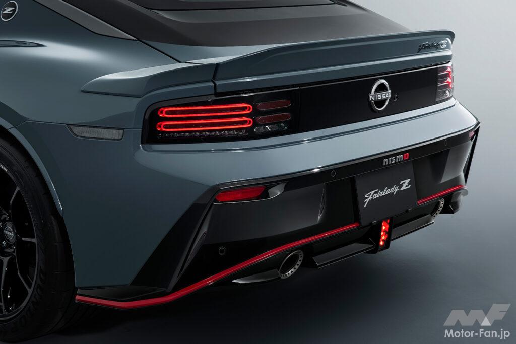 その中でRZ34型のフェアレディZ NISMOは、初代S30の中でも「Gノーズ」と前後オーバーフェンダーがレーシーな装いで人気が高い240ZGをモチーフに、前後オーバーハングとトレッドを拡大。ダックテール型のリヤスポイラーも基準車より大型かつリヤフェンダーにまでまたがった三分割構造として、空力性能を向上させている。