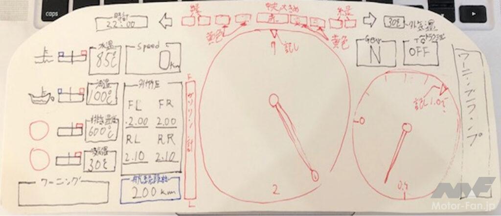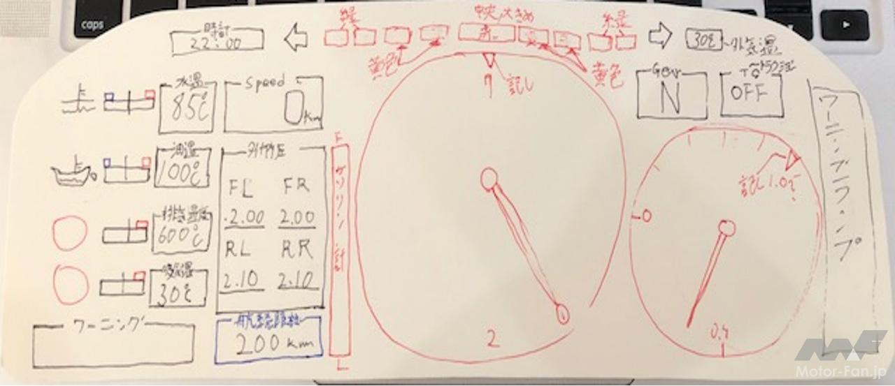松田選手はアナログ式のタコメーターを中心に置き、かつレッドゾーンの起点を真上(12時)に配置。さらにその上にシフトアップインディケーターを配置することで、シフトアップのタイミングを取りやすくすることを提案。さらに、サーキット走行時に厳しくなる水温と油温を確認できるよう水温計と油温計、またVR30DDTT型3.0LV6ツインターボエンジンを新たに搭載したのに合わせてブースト計を追加したのも、松田選手のアイデアだ。
