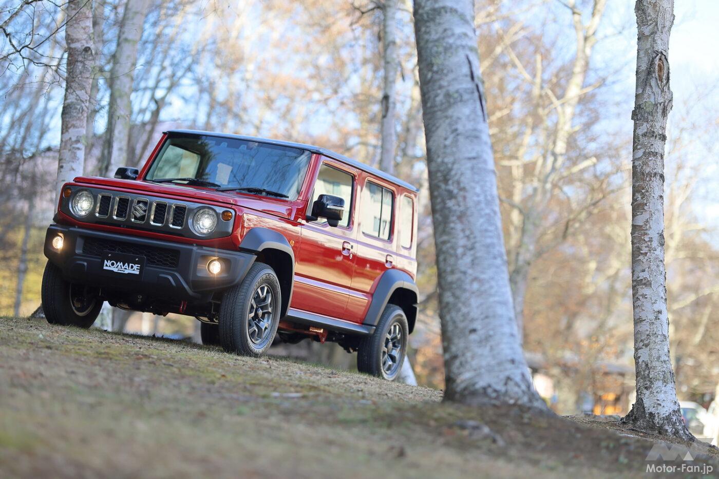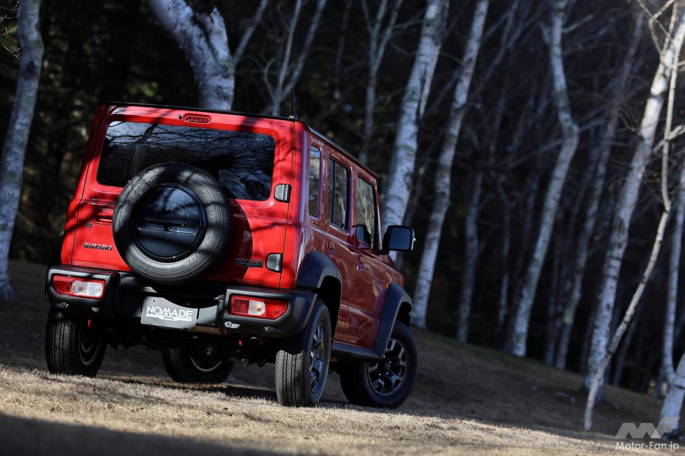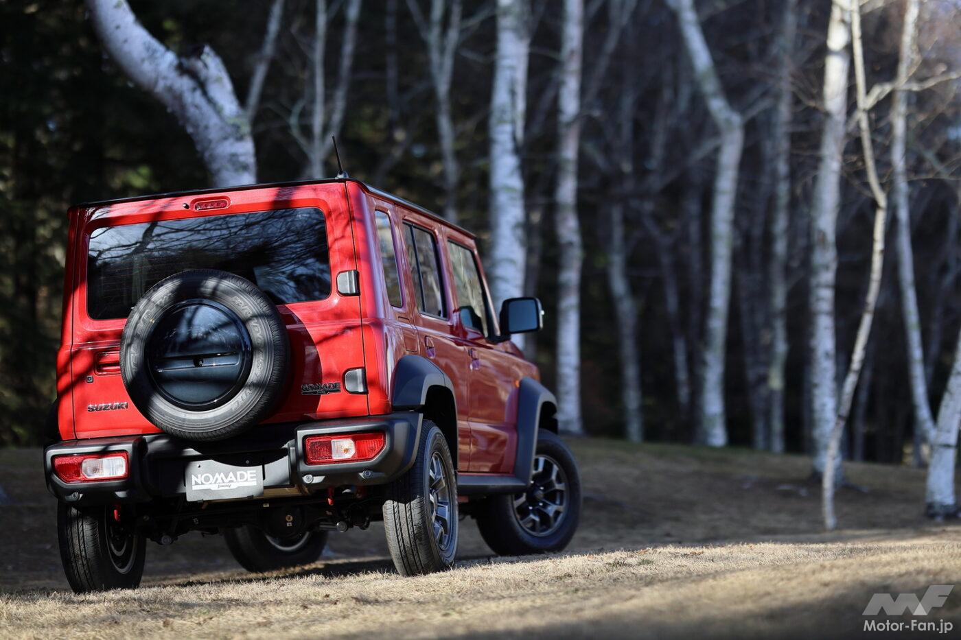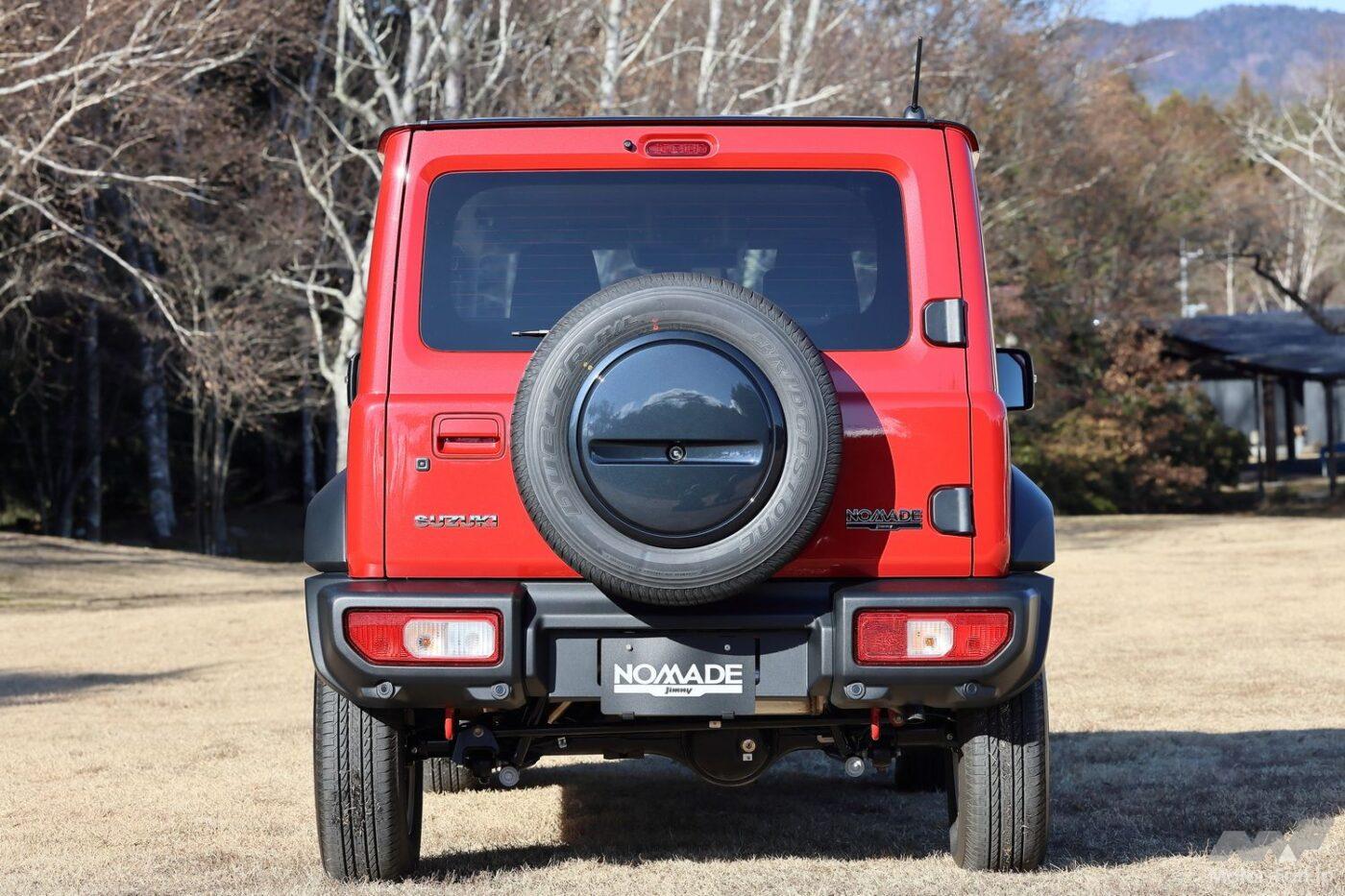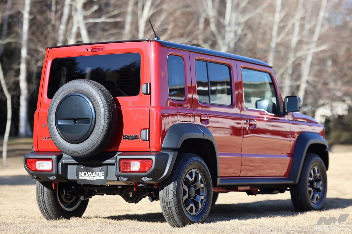 ステアリング切れ角を決めるには、「オフロード走行時にフルロックまで切った状態で、ローレンジの強い駆動力をかけても大丈夫」といえる強度や耐久性を考慮しなければならないからだ。日本で売るならば取り回しを配慮するのか、それともジムニーにふさわしいオフロード性能のどちらを取るかとなったときに、当然のように後者を選んだのがジムニーノマドというわけだ。