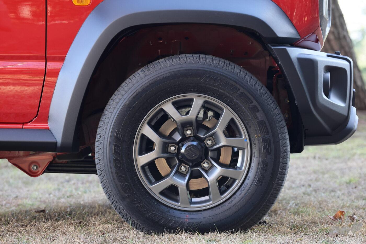 ジムニーノマドのシルエットを確認すると、全長は3890mmとなっている。これは3ドア(ジムニーシエラ)比で340mm長いものだが、ホイールベースも同じだけ伸びて2590mmとなっている。つまり、前後はそのままにキャビンだけ延長したボディと捉えていい。また、オーバーフェンダーのデザインもジムニーシエラと共通で、タイヤサイズも同じとなっている。Aピラーから前を真横から見ると、一目で区別するのは難しいだろう。