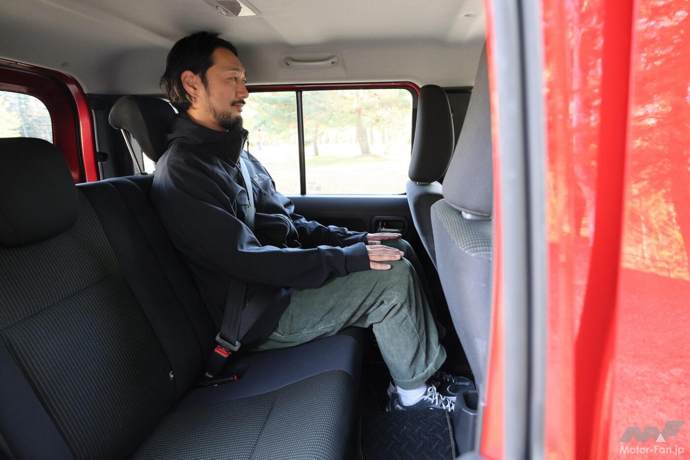 今回の撮影では向きを変えるくらいの運転しかしていないので走破性について云々できないが、それでもオフロード走行を考慮していると感じたのはステアリングの切れ角が3ドアと同じ程度だったこと。後から確認すると切れ角は3ドア、5ドアで共通にしているという。ホイールベースを伸ばして、切れ角を変えないということはそれだけ小回り性能にはネガティブになるが、オフロード性能を考えれば致し方ない判断だろう。