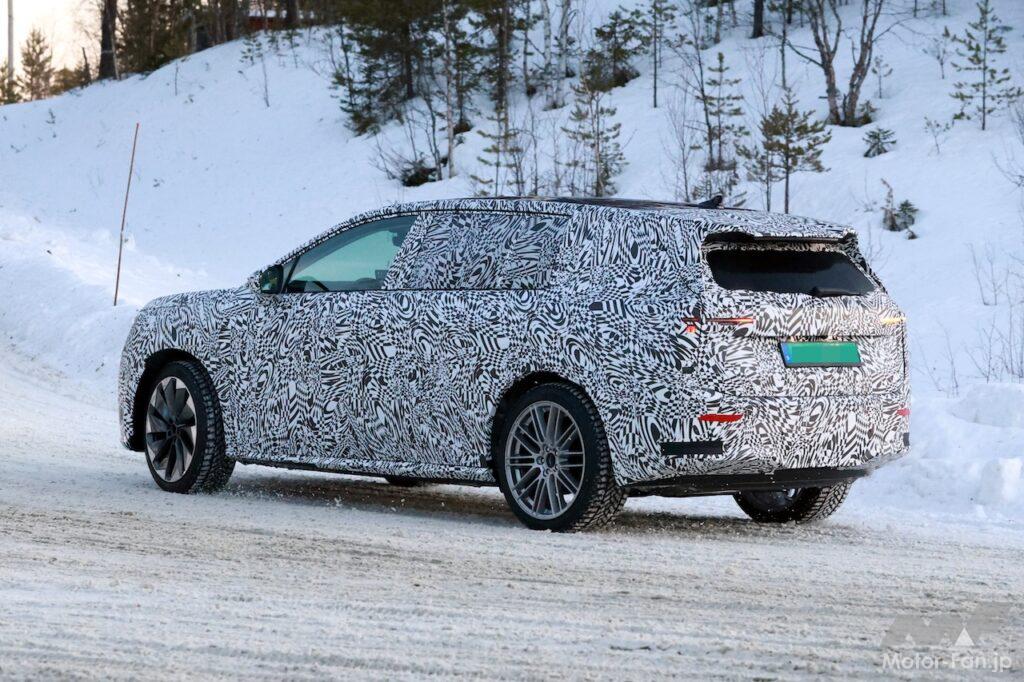 後部では、大きなスポイラーと垂直のテールライトが見て取れる。ライトはリフトゲートに流れ込んでおり、コンセプトモデルの面影を残している。同社はボディサイズに関して、全長は約4900mmと述べており、これはエンヤックよりも250mm長い。