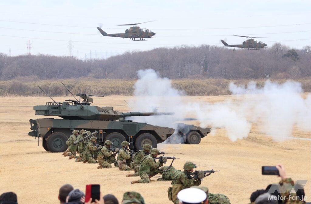 また、訓練展示では、習志野演習場を「島」に見立て、「敵が侵攻した島嶼部を奪回・確保する」までの一連の流れが披露された。偵察や本隊の誘導を担う少数の事前潜入部隊の降下と、降下地点一帯の安全確保ののち、空挺団本隊がパラシュートやヘリボーン(ヘリ空輸)で降下。戦車を含む反撃部隊の上陸によって敵を撃破する流れは、例年通りだ。だが、今回はラストに同盟国・同志国11カ国の空挺部隊が来援、巨大な国旗を翻して自衛隊の戦列に加わるという演出がなされ、多国間の連携を強く印象付ける内容となっていた。