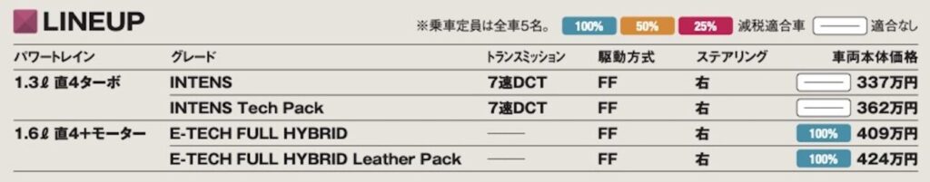 日本仕様のパワートレインは2種類。手頃な1.3ℓターボ+7速DCTも、同クラスのエンジンとしては頭ひとつ抜けたパワフルさが自慢である。ただ、さらに注目すべきは上級の「E-TECHフルハイブリッド」で、1.6ℓ自然吸気エンジンをベースにした欧州でほぼ唯一の本格ストロングハイブリッドとなる。