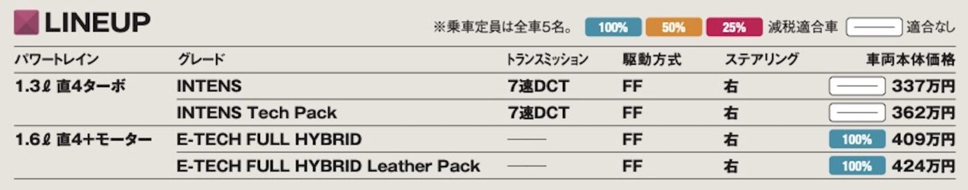 日本仕様のパワートレインは2種類。手頃な1.3ℓターボ+7速DCTも、同クラスのエンジンとしては頭ひとつ抜けたパワフルさが自慢である。ただ、さらに注目すべきは上級の「E-TECHフルハイブリッド」で、1.6ℓ自然吸気エンジンをベースにした欧州でほぼ唯一の本格ストロングハイブリッドとなる。