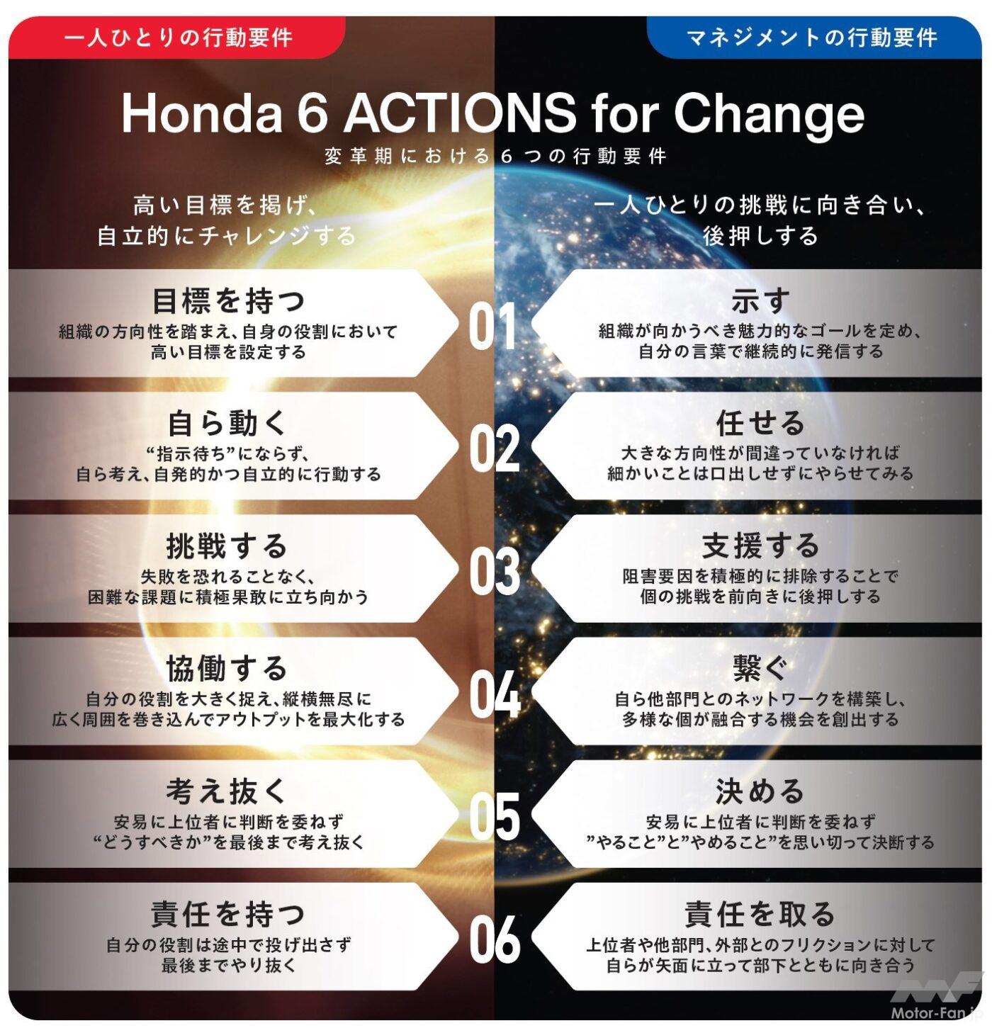 さらに2025年4月から、変革期における行動要件「Honda 6 ACTIONS for Change」を明示し、企業風土改革プログラムをスタートさせる。個の挑戦の最大化を図るために1on1などのコミュニケーション頻度を上げ、内発的動機の醸成や高い目標設定の促進を図っていく。また、新たな価値創造を活発化するために、ワイガヤの場づくりや、目標達成を妨げる障害の克服を支援するコンフリクトマネージメントを積極的に進めていくという。すでに2024年に部分的にトライアルを行ない、一定の成果を確認済みだ。