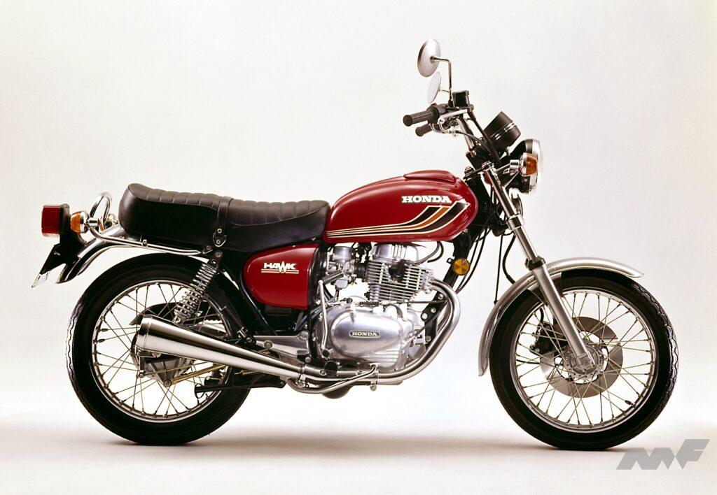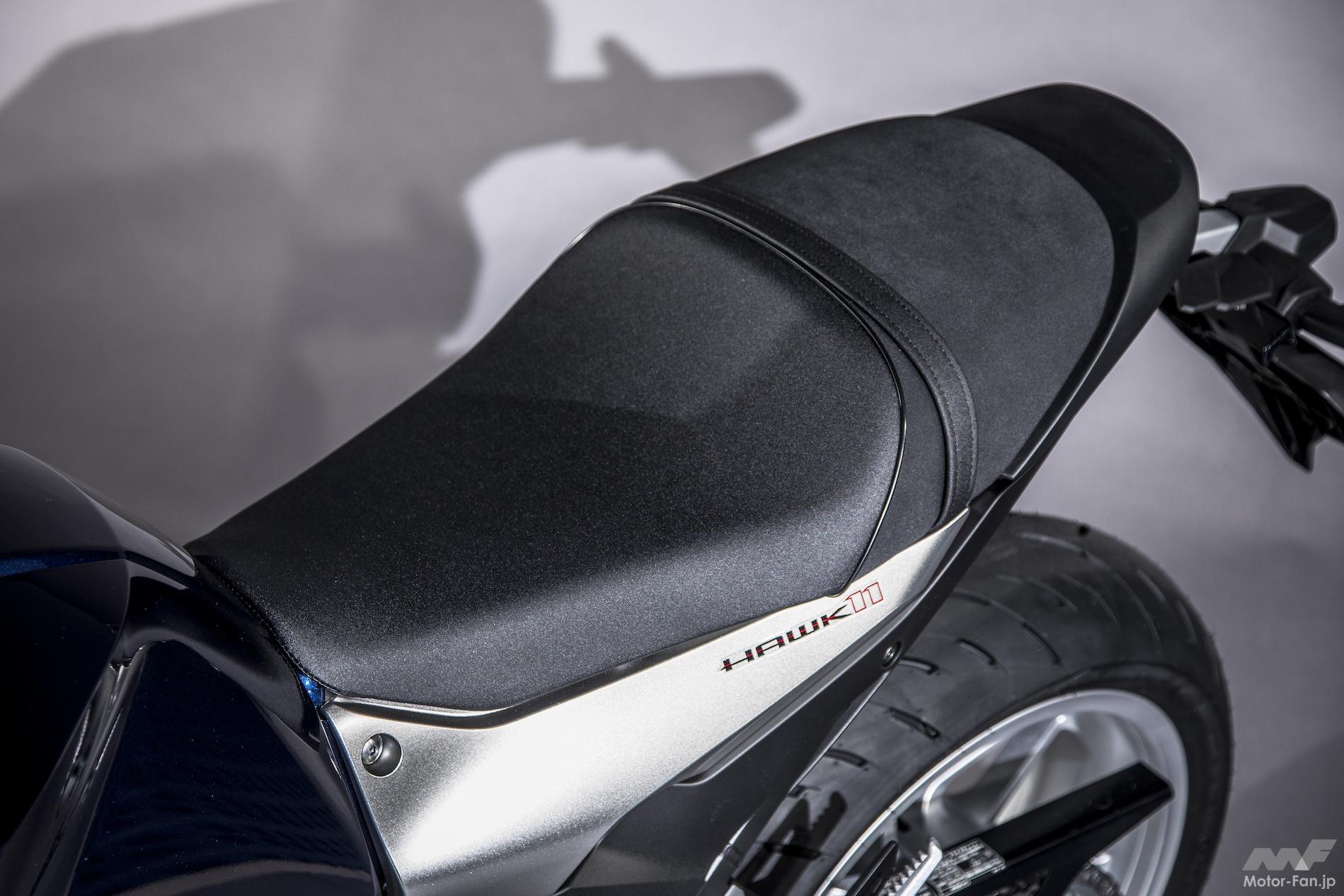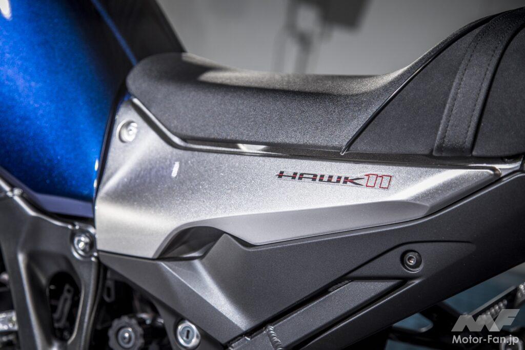 初見の印象はロケットカウルを備えるフロントと、サイドカバーより後ろのデザインがちぐはぐに感じられたが、見慣れてくると素直にかっこよく感じる。特にマフラーのない左サイドから見るとスマートさが強調されるので、個人的にはシート下にマフラーを配置してもいいように思えた。ただ、気になるのは車名で古い時代のホークを知っている世代だと「これがホークなの?」と思ってしまうかもしれない。ともあれ2気筒らしいスリムさとカフェレーサースタイルが好きなら、魅力的なモデルだと言える。最後に過去のホークたちも振り返って比較してみてほしい。