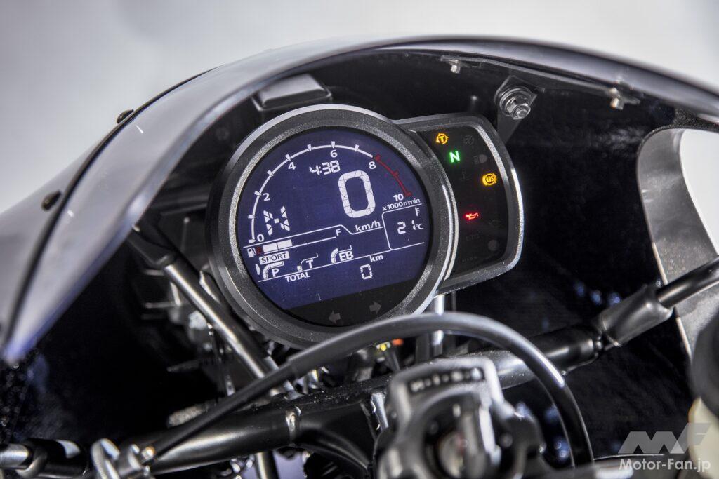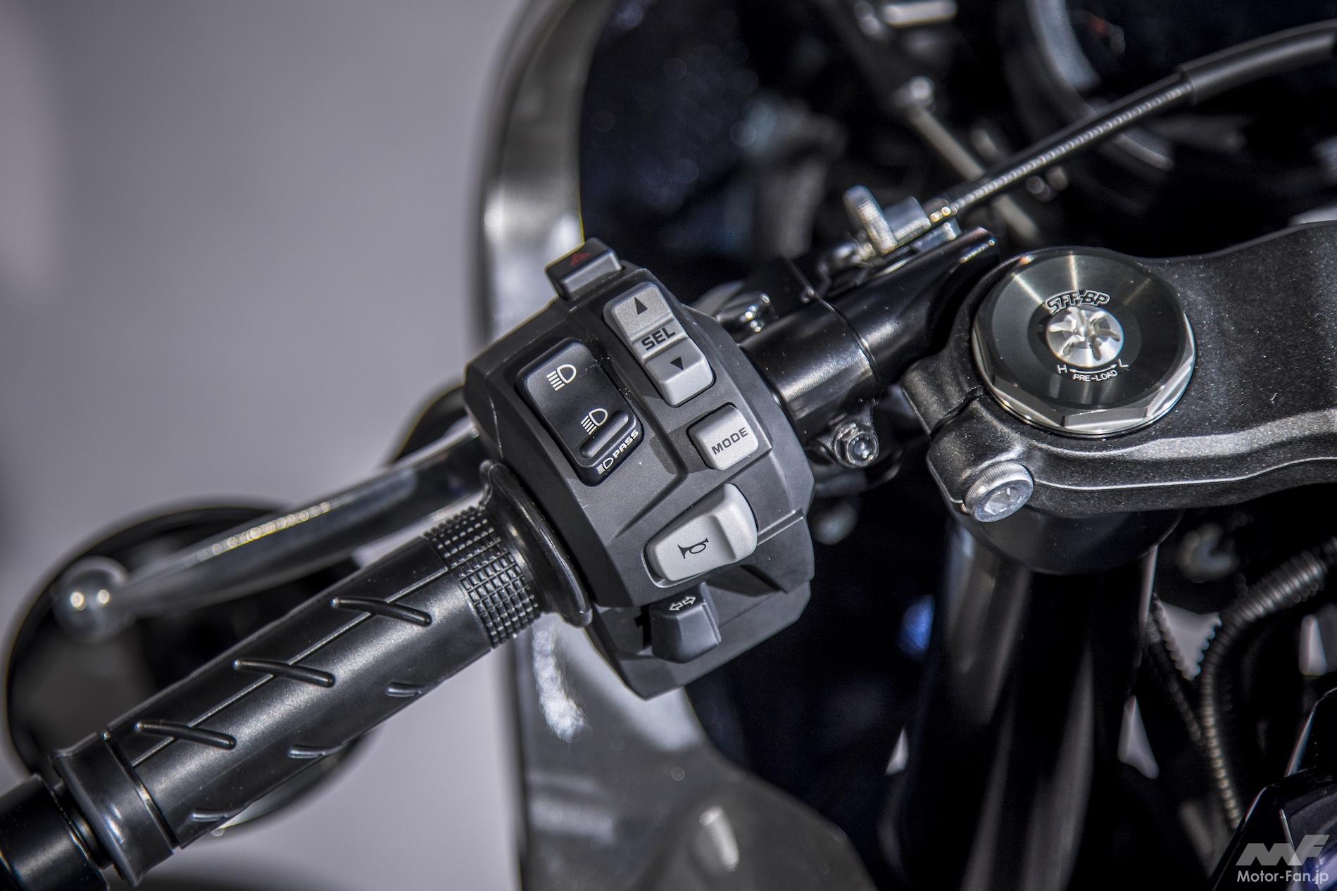 メーターやハンドルスイッチなどはレブルからの流用に思える。デジタルメーターはDCTの表示こそないが、デザインなどはほぼレブル1100と同じだし、ハンドルスイッチ、特に左スイッチはもDCT用のシフトチェンジスイッチがないだけに見える。また右スイッチはスタートボタンを兼用するキルスイッチがあるだけで、そのデザインは専用かもしれない。