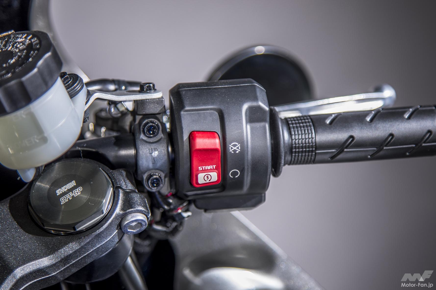 この日はまたがって足つき性を確認することも許された。試した筆者は身長163cmで足の長さもやや短め。最近お腹が出てきたことを気にする中年体型でもある。またがってみると前傾具合はそれほど辛いものではなく、お腹がタンクに当たって困るとも感じない。両足立ちでもつま先が着地するので、おそらく標準的な日本人であれば問題ないレベルだろう。ただ筆者の場合、片足でも踵が浮いてしまった。だが、カフェレーサーという言葉ほど姿勢が厳しくならないのも事実。筆者としては左足を下ろした位置にチェンジペダルとリンクがあるので、足つき性が悪く感じたくらいだ。