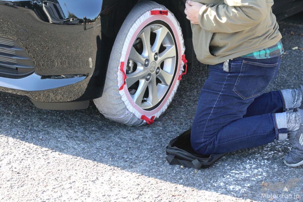 まずパッケージングだが、装着時に膝置きにもなる樹脂製のコンパクトなケースに、タイヤ2個分のチェーン本体と腕カバ—、作業用手袋、そして水や雪に触れても安心なビニール製の取扱説明書が納められている。装着時にジャッキや工具などは一切不要で、装着も説明書の手順で進めていけば、10分程度で装着できるはずだ。
