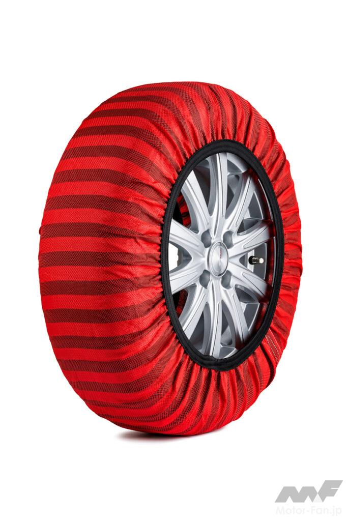 トレッド面近くに縫い目のない1枚布の設計で、高い伸縮性を持つ一体型内部ゴムにより、タイヤの円周にピッタリフィット。破損のリスクを最小限に抑えている布製タイヤチェーン。ラインアップは全12サイズ。