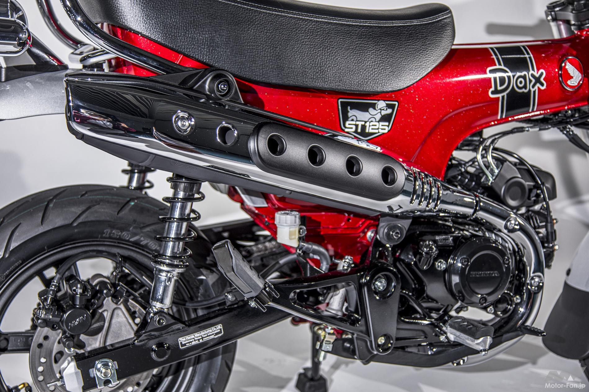 エンジン自体はグロム用として開発されC125やCT125、モンキーにも転用されたものと考えていいだろう。グロム用だとシリンダーもヘッドも黒く塗装されているが、ダックスではシリンダーヘッドが黒、シリンダー自体はシルバーと色分けされている。モンキーだといずれもシルバーなので、同じエンジンとはいえ印象は変わる。エキゾーストは直後に車体後ろへ伸びてキャタライザーを経由した後、また前に戻してアップマフラーへと繋げている。マフラーガードのデザインは1995年に復刻されたダックスと似たものとされ、初代エクスポートとは印象が異なる。