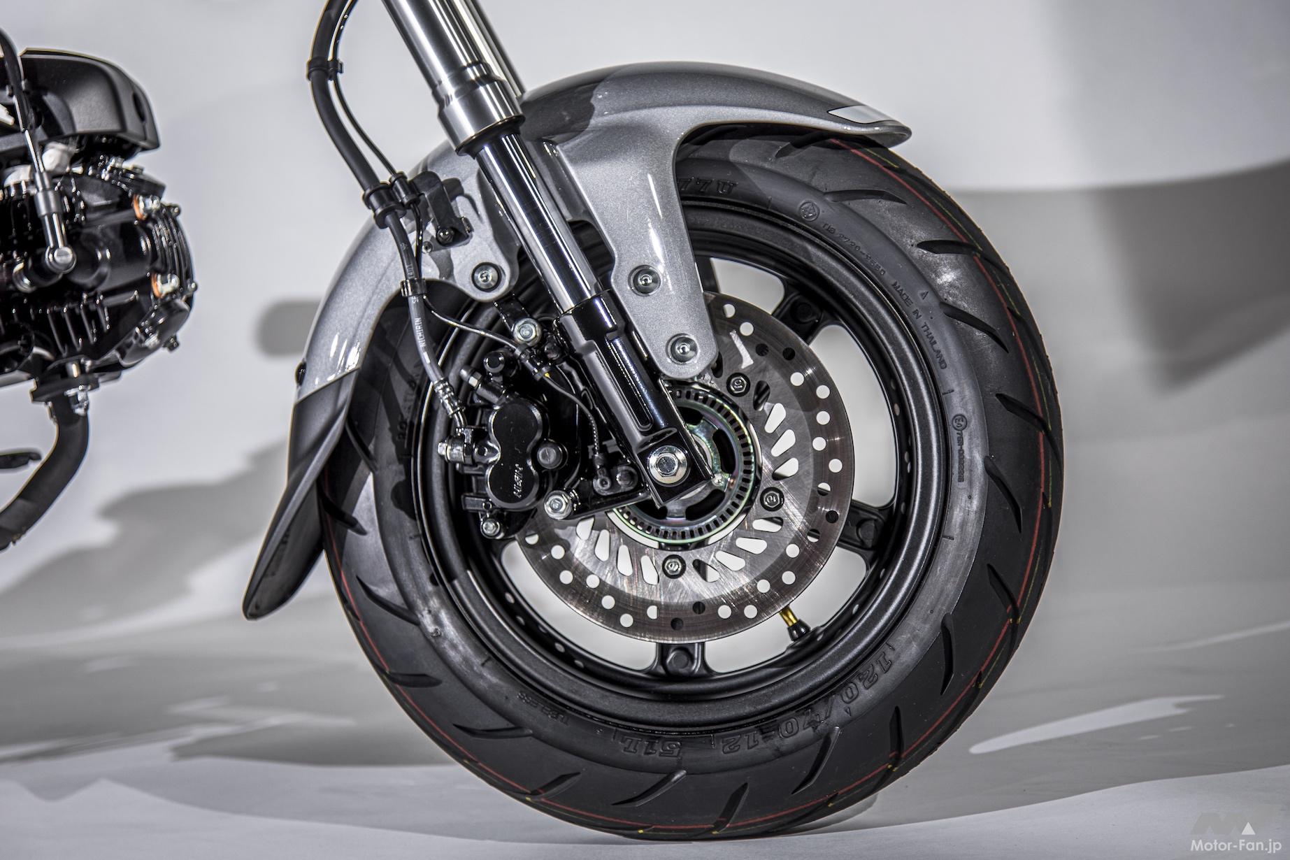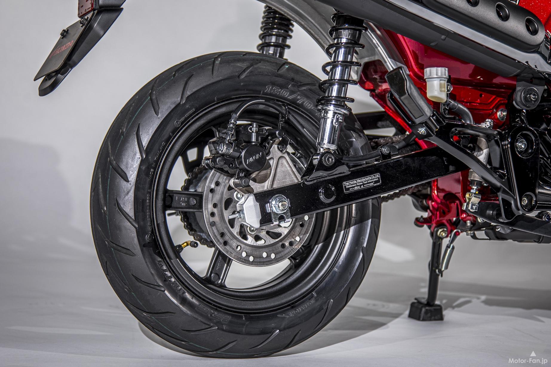 前後とも10インチタイヤを採用して伝統を継承しているが、ホイールは前後ディスクブレーキとなったことでキャストホイールになっている。5スポークでグロム用とよく似たデザインだ。ツインショックとなるリヤサスペンションは実測で340mmの長さとなり、スイングアームはモンキー125ともグロムとも異なるデザインとされている。