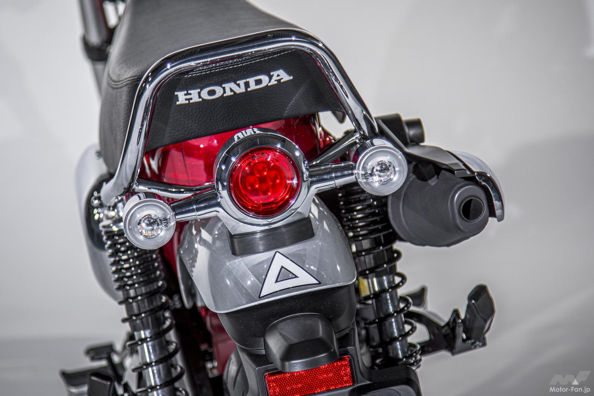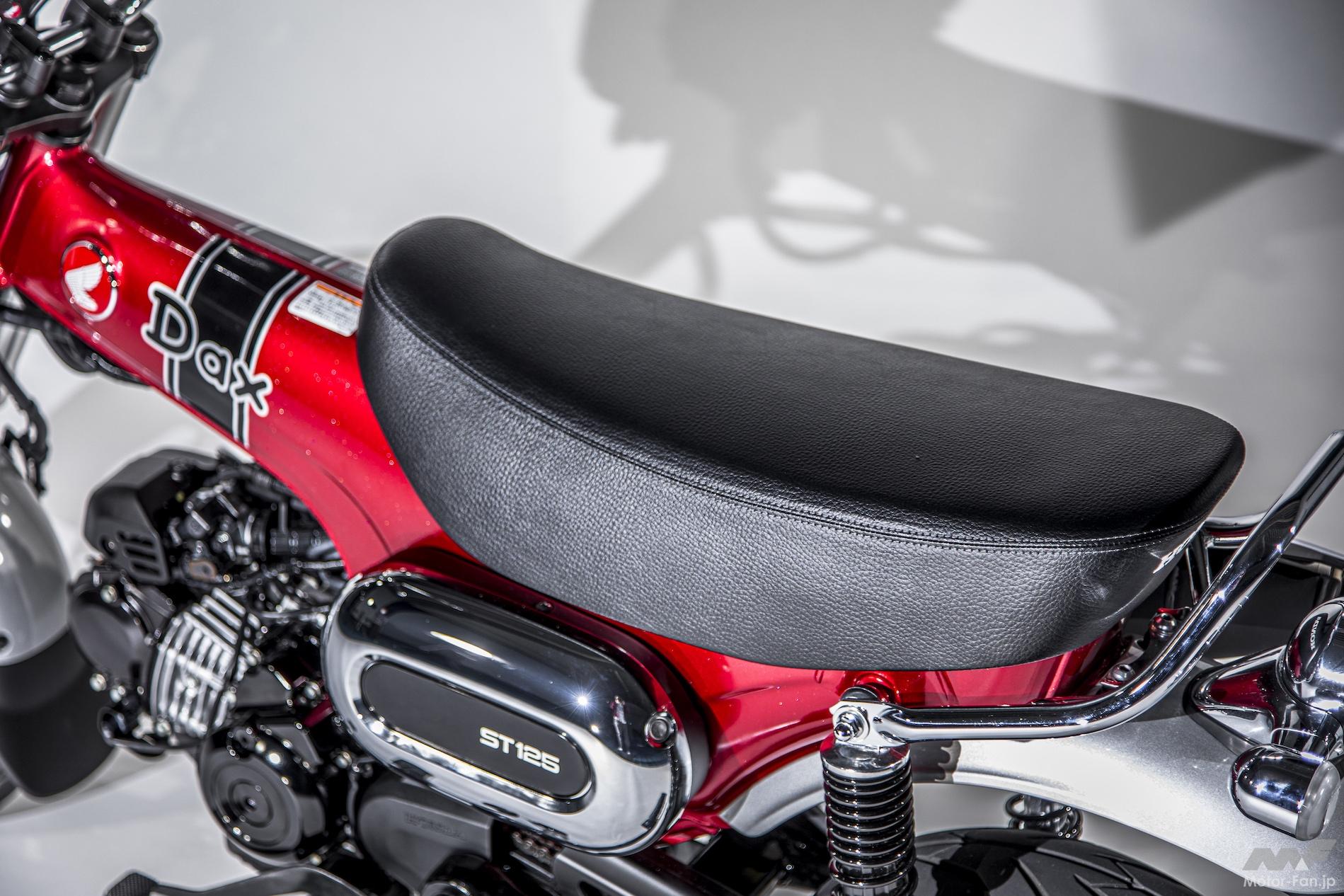 Tボーンフレームとともにダックスのスタイルを特徴付けているのが反り上がるデザインのシートだろう。こちらもサイズを計測してみたところ、長さが530mmで前側の幅が220mm、後側の幅が230mmだった。これだけのサイズならダンテムしても無理なく走れることだろう。シートに沿うようにデザインされたタンデムバーは標準装備されるのか、オプション部品なのかは現時点で不明。またLEDによるテールランプはモンキー125と共通に思える形状だった。