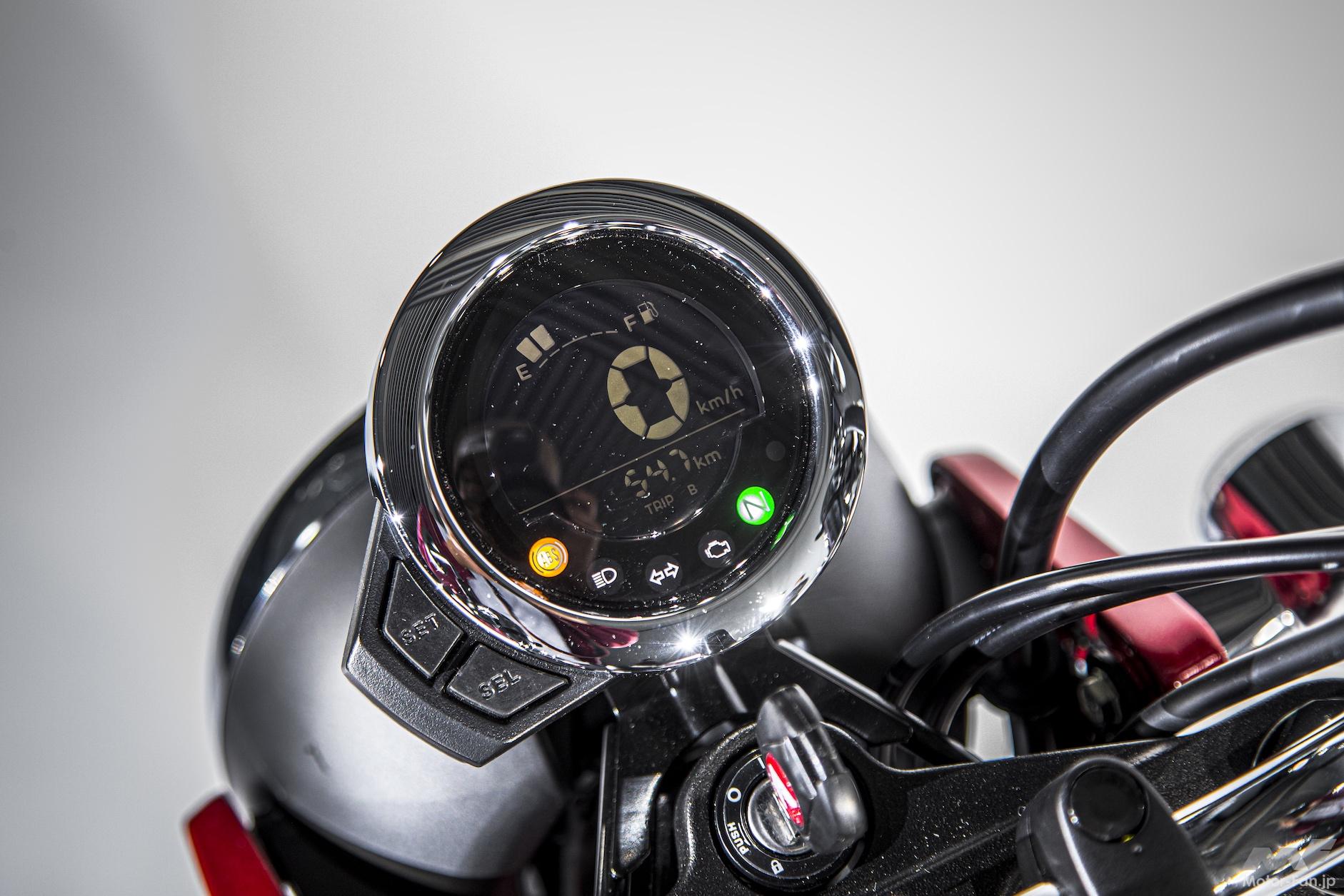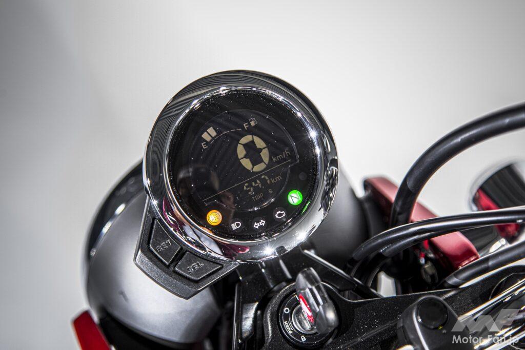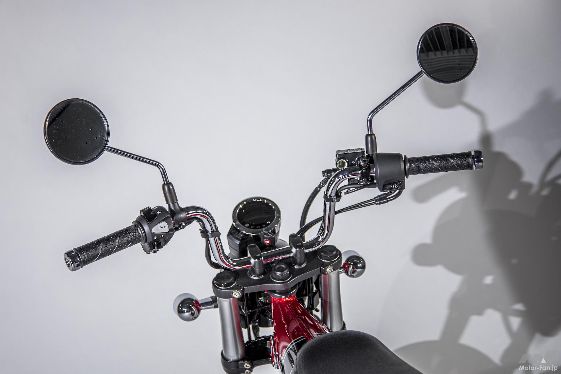 ダックスといえば「クルクルハンドル」などと呼ばれ、取り外しが可能なハンドルが特徴だった。だが今回の新型では一般的なアップハンドルが装備されている。以前のモデルはハンドルを外して4輪のトランクに積載可能なサイズだったから意味があったけれど、新型は気軽に積めるサイズではないので、これも致し方ない。ハンドルの幅は実測で75mm。ハンドルホルダーはモンキー用と違うデザインのものだが、丸いデジタルメーターはモンキー125と同じものだろう。