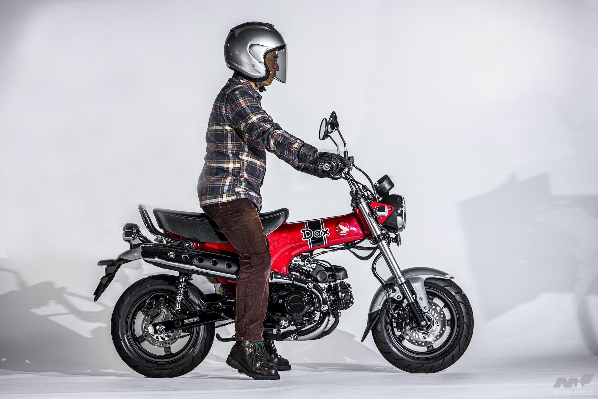 どれだけ大きくなったかは実際にまたがった写真をご覧いただくとわかりやすいだろう。ちなみに筆者は身長163cmで純和風な短足体型だ。それゆえ足つき性にはシビアなわけだが、新型ダックスは両足だと足指の付け根まで届くので不安感はない。片足ならしっかり踵まで届くので、取り回しに苦労することはない。初代ダックスホンダST70エクスポートを所有していた経験があるので「ずいぶんと大きくなったな」という印象は拭えないが、このサイズと125ccエンジンであることなどから、街中を走っていて怖い思いをすることはなさそうに感じた。