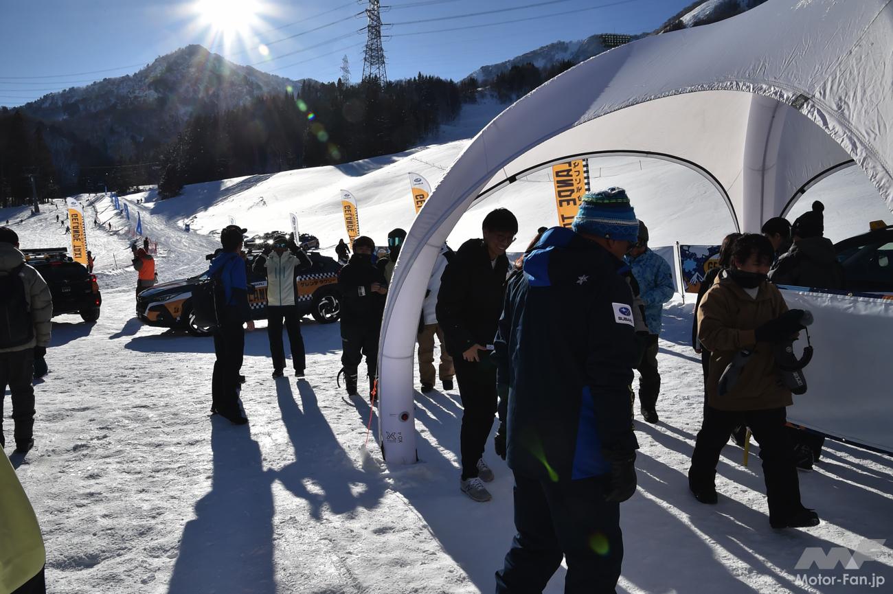 大勢の来場者がスバルのAWDとプロドライバーの走りを体験したゲレンデタクシーだが、クルマから降りてきた参加者は一様に笑顔でエキサイティングな体験に興奮を隠せない様子。特にファミリー層では子供達が大はしゃぎだったのが印象深い。また、昨今はスキー場でも多い外国人旅行者もゲレンデタクシーを体験していた。
