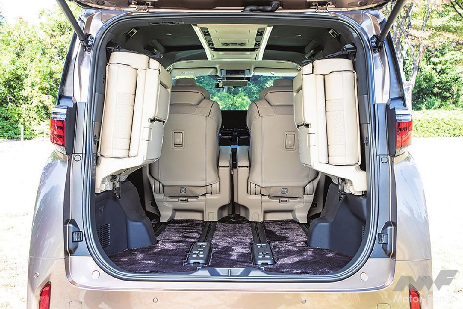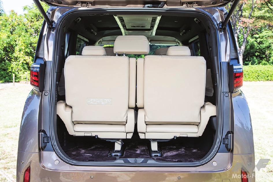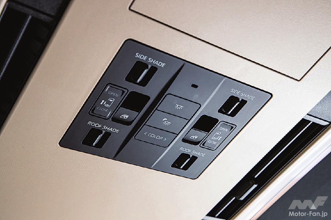 特等席となる2列目席も大幅に進化。プライベートジェットをイメージしたその空間は、従来、天井左右に配置、点在していた照明や各種スイッチ、後席エアコン吹き出し口などの機能をルーフ中央にある、新開発されたスーパーロングオーバーヘッドコンソールに集約。「エグゼクティブラウンジ」は左右各席にあるスマホサイズの取り外し可能なリヤマルチオペレーションパネルによって多彩な機能を手元でも指先ひとつで操作可能(反対側席の操作もOK)。そして先代モデルで気になったキャプテンシートの微振動の解消も先代を知るユーザーにとっては納得の徹底した防振対策が施されている。また、パワーバックドアのスイッチはボディサイド側に移設され、3列目席の跳ね上げ格納位置が前後2ポジションとなり、2列目席を後端までスライドしても3列目席の跳ね上げが可能になったのも特筆点だ。