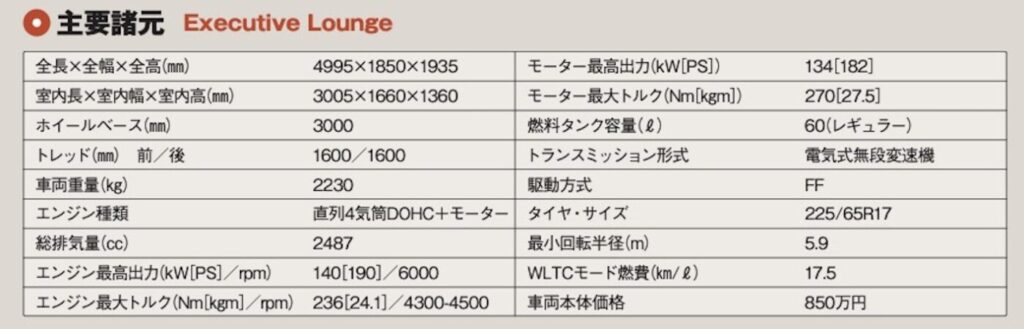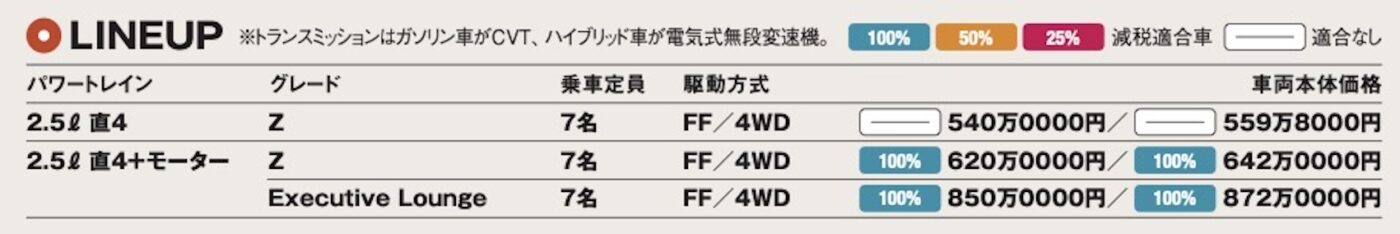 パワーユニットは2.5ℓガソリンと2.5ℓ+2モーターのHVの2タイプで、HVにもFFが用意される(先代のHVは4WDのみ)。グレードは現時点で2列目が豪華キャプテンシートの「エグゼクティブラウンジ」と「Z」の2タイプ。前者は乗り心地重視の17インチタイヤ、後者はやや走りに振った18インチタイヤを装着する。