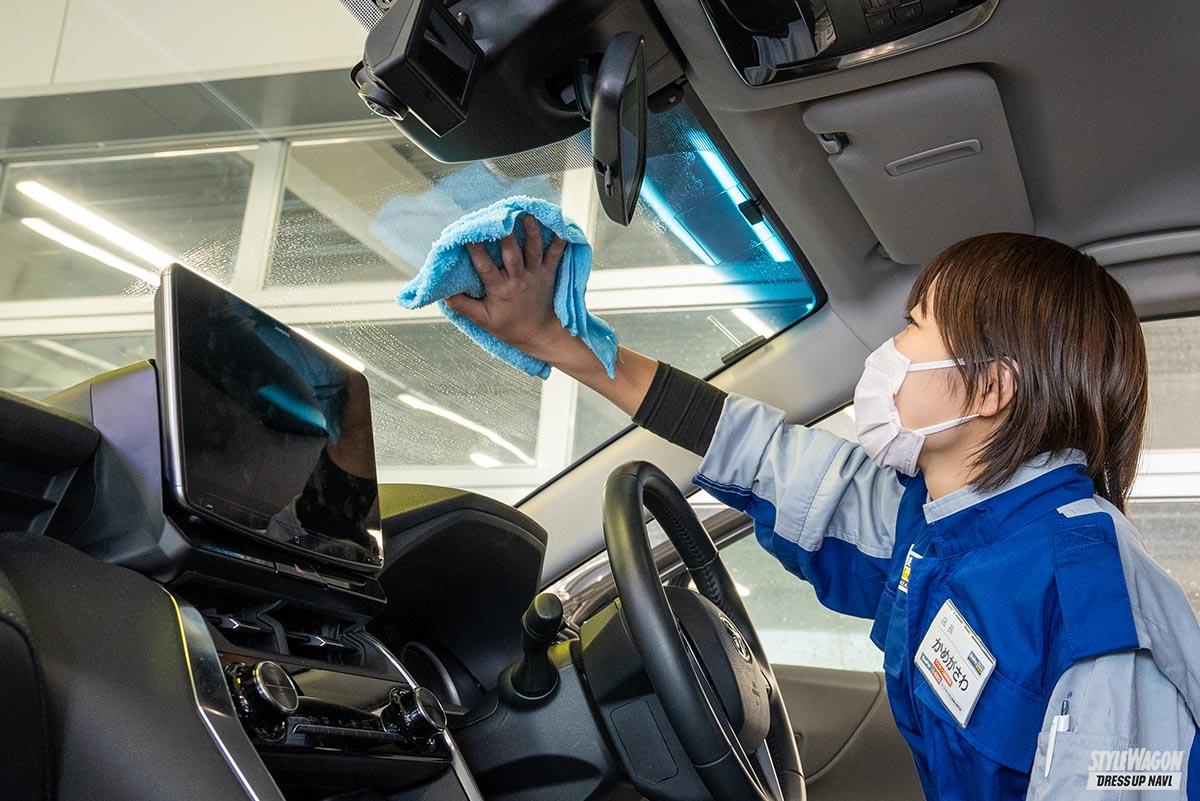(手順3)大事な作業でもあるのが内窓拭き作業。知らぬうちに走行中に取り入れている外気の影響で、ススやチリといった汚れが付着して汚れがついている。