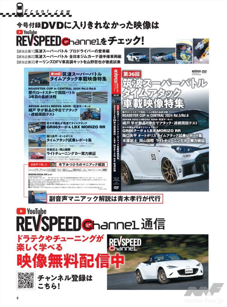 また、今回の付録DVDは2層203分の特盛版。筑波スーパーバトルでのプロドライバーのオンボード映像がふんだんに収録されている。加えて、『Roadster CUP in CENTRAL CIRCUIT 2024 Rd.5/Rd.6』『ADVAN A052とNEOVA AD09の高性能が長持ちはどこまで本当か? 織戸 学が筑波で徹底テスト』『ボルトオンターボGR86と早くもライトチューンのLEXUS LBX MORIZO RR 佐々木雅弘×筑波タイムアタック』など、見応えたっぷりの構成となっている。