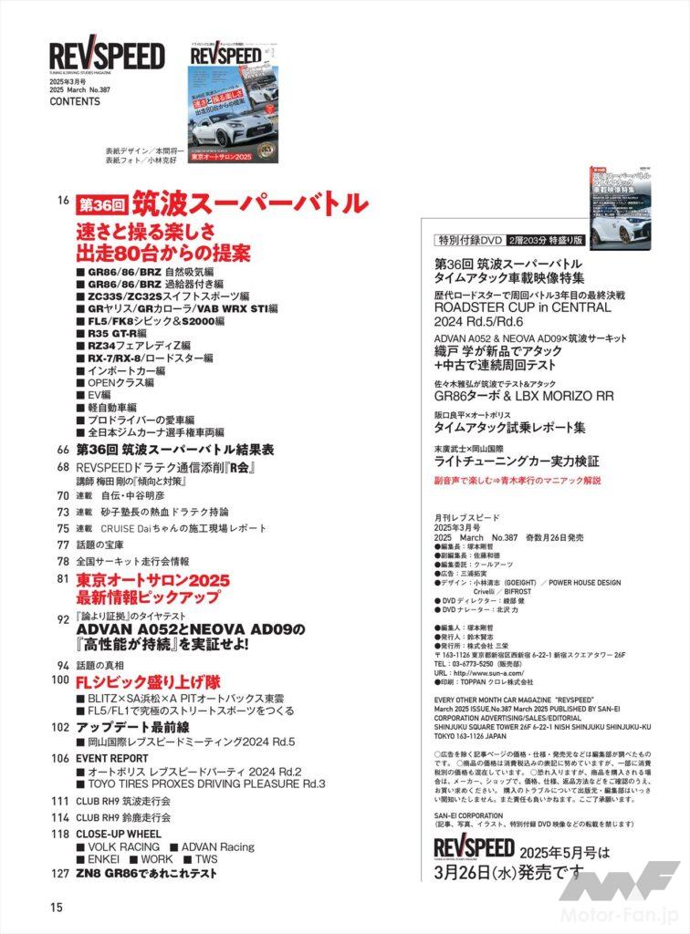 ドライビングとチューニングを掘り下げるレブスピードの最新号では、2024年12月に行われた第36回 筑波スーパーバトルと2025年1月の東京オートサロン2025を特集。前者では出走した81台の仕様と走行データに基づいた“提案”を公開。後者では、オートサロンに出展したチューナーなどの最新情報をピックアップしている。