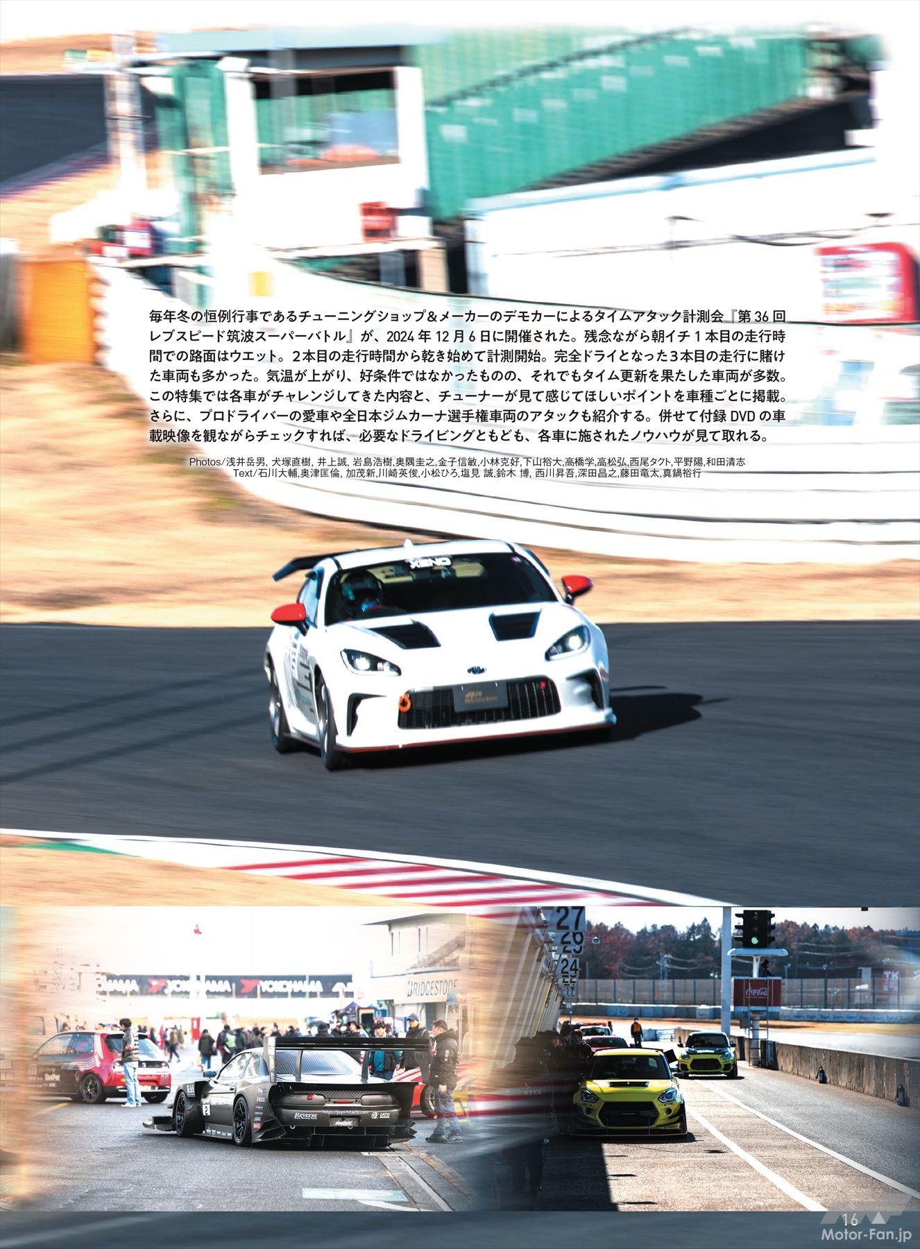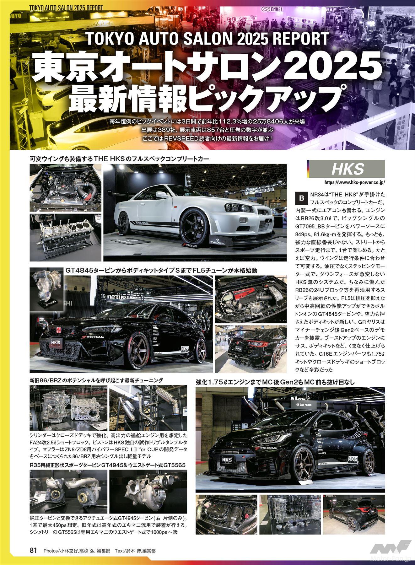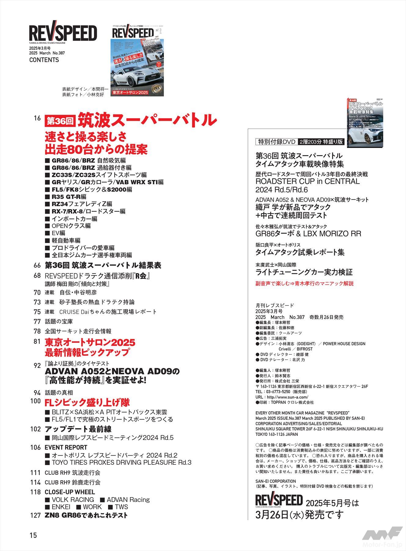 ドライビングとチューニングを掘り下げるレブスピードの最新号では、2024年12月に行われた第36回 筑波スーパーバトルと2025年1月の東京オートサロン2025を特集。前者では出走した81台の仕様と走行データに基づいた“提案”を公開。後者では、オートサロンに出展したチューナーなどの最新情報をピックアップしている。