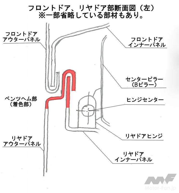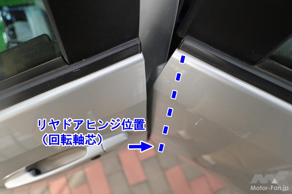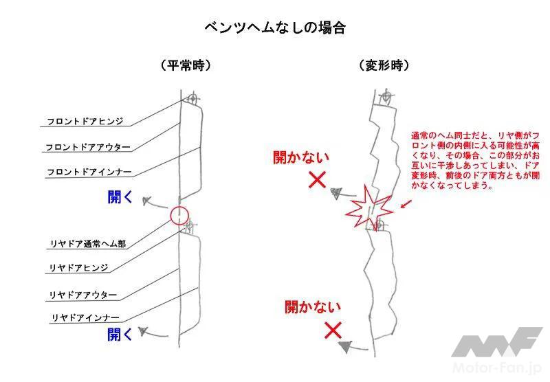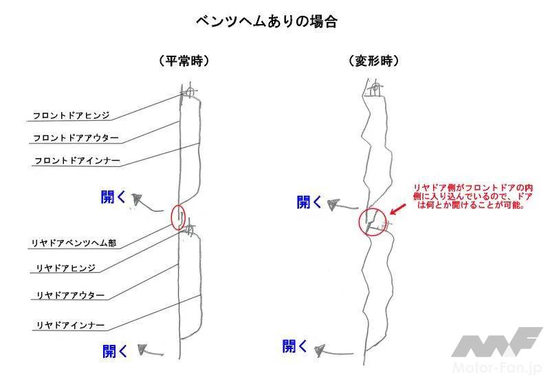 そもそもスライドドア開時は、ロック解除したスライドドア後端を外に押し出して開くため、その反対側の前端はいったん内側に引っ込む軌跡をたどる。ここにもしベンツヘムがなく、衝突時の変形でリヤスライドドア前端がフロントドアにかぶってしまったら、やはり前後のドアが開かなくなってしまう。もぐりこむことができなくなるからだ。