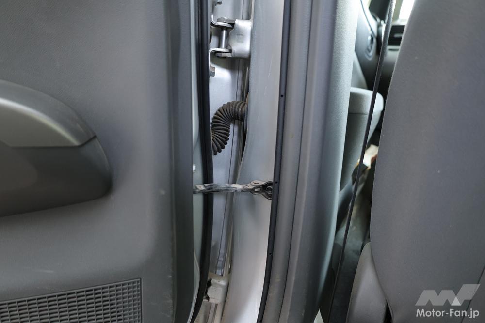 また、さきに「・・・一部の例外を除いて・・・」と書いたが、それは写真のハイエースで、フロントドア後端とリヤドア前端が、外に露出しているセンターピラー(Bピラー)で断たれているようなクルマにもない。