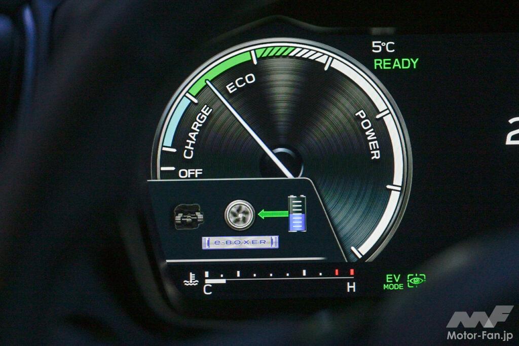 スバル・クロストレックに設定されたS:HEVグレードは、e-BOXER(ストロングハイブリッド)と呼ぶスバル初のストロングハイブリッドシステムを搭載する。マイルドハイブリッド(MHEV)のe-BOXERに追加する形で設定された。MHEV版のe-BOXERはエンジンをメインに走行し、モーターはアシスト役として機能するが、e-BOXER(ストロングハイブリッド)(まぎらわしいので、以下S:HEV)はモーターをメインに走行し、モーターの苦手領域をエンジンがカバーして走る。主従関係が逆だ。