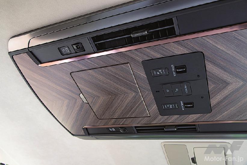 後席には気分によって後席機能をまとめて最適化するコンシェルジュ機能も備わっている。そのひとつである「ドリームモード」にすると、サンシェードで室内は暗くなるのだが、シートはフルフラットではなく、適度にアップライトな姿勢となるのが面白い。そうやって身体を適度にホールドした方が、走行中は安眠できるからだという。LMは静粛性も非常に高いが、かといって〝無音〞というほどではないのは、天井をあえて音を反射する素材にするなどの意図的な仕立てによるものだ。聞けば、開発途中に静粛性を極限まで追求したところ「静か過ぎると逆に不快になる」ということを発見したからだという。