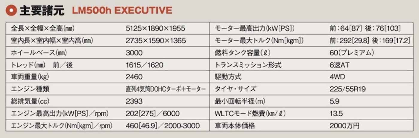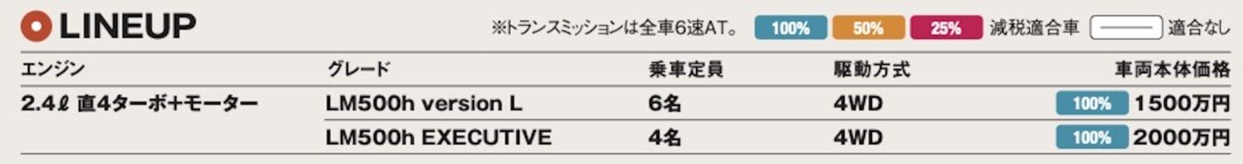 日本仕様のLMのパワートレインは「500h」という車名からも想像できるように、ヴェルファイア「Zプレミア」と共通の2.4ℓターボ+6速ATにモーターを追加したハイブリッドで、リヤにもモーターを配する4WDのみとなる。バリエーションは2種類で、3列6人乗りの「バージョンL」と、2列4人乗りの「エグゼクティブ」がある。