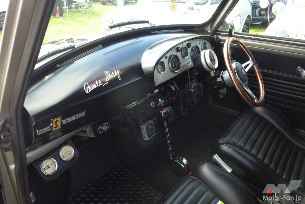 エレノア仕様のミニ・クーパーのインテリア。ワンオフと思しきダッシュボードにはキャロル シェルビー のサインを再現。エレノア仕様に必須のGO-BABY-GOのシフターに、ニトロボトルとニトロスイッチまで再現している。『ジャパンミニデイ』にしか参加しないのは実にもったいない。MOONEYESの主催イベントやアメフェスでも十分アワードが狙えるレベルの完成度の高さだ。