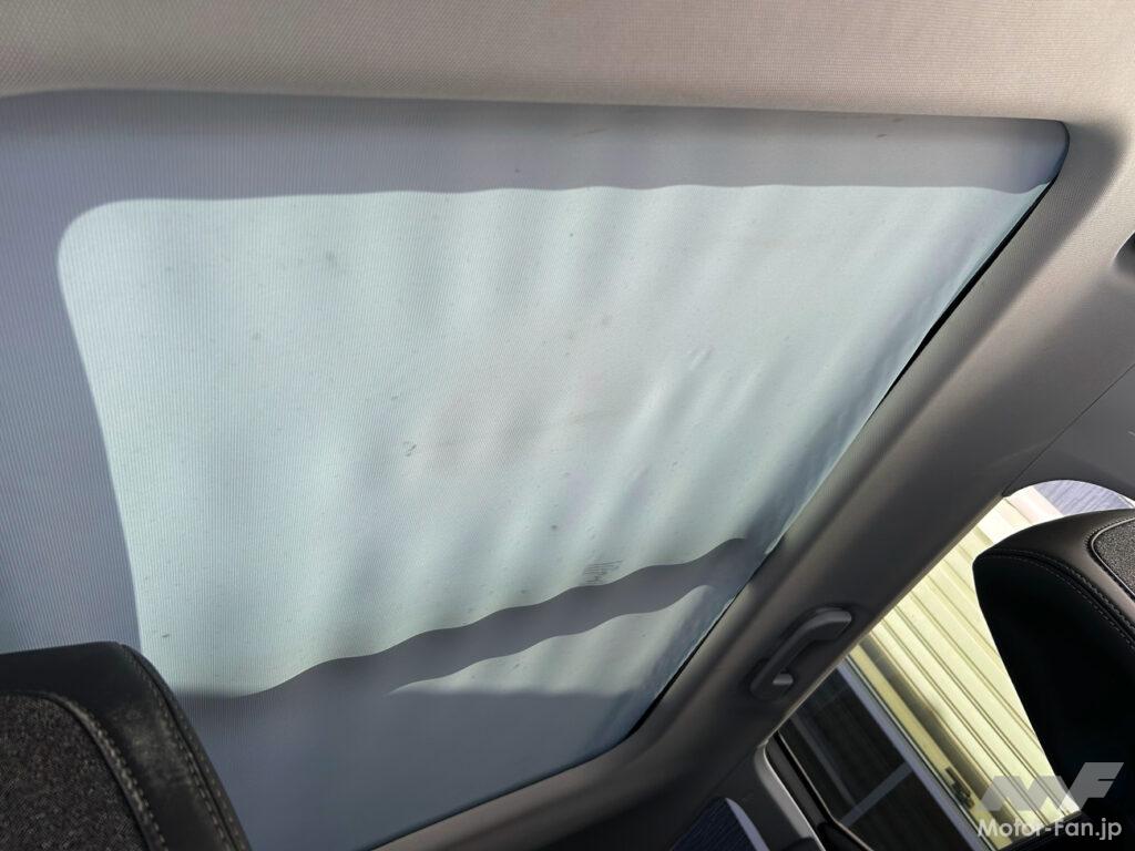 お気に入りポイントでもある「パノラミックサンルーフ」だが、やっぱり暑い(苦笑)。冬でも天気のいい日は暑かったりするのだ。ただ、それは想定内だから気にしていない。問題はルーフのカバー。なんだか布みたいなフニャッとした素材で、安っぽい(汗)。