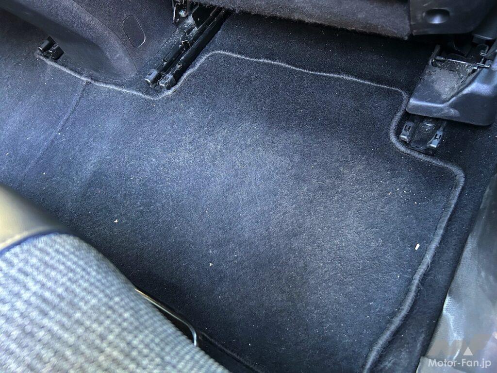 写真では分かりづらいが、素材が粗悪で、すでに中央部分が擦れすぎて穴が開きそう。で、こすれたカスがフロアマットをめくった下に落ちてしまう。納車時に綺麗にしてもらっていたが、すぐにカスだらけになってしまうので、これは早々に買い替えなければならなそう。