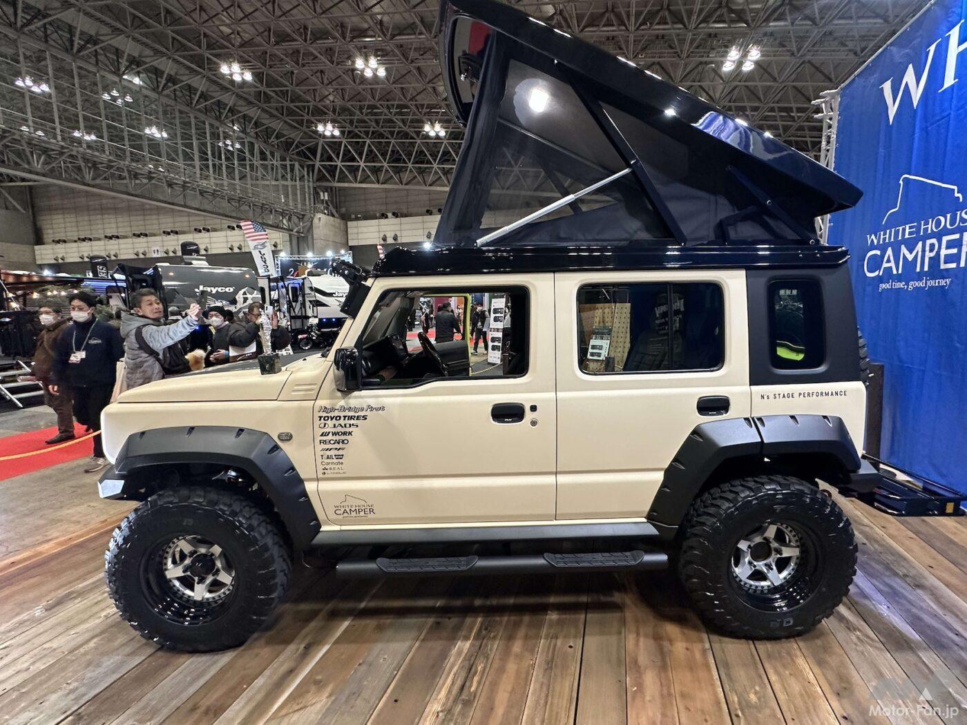 東京オートサロン2025にも出展し、東京国際カスタムカーコンテスト「ドレスアップ/SUV部門」で優秀賞を獲得したホワイトハウスのジムニー・ノマドのポップアップルーフも注目を集めていた。