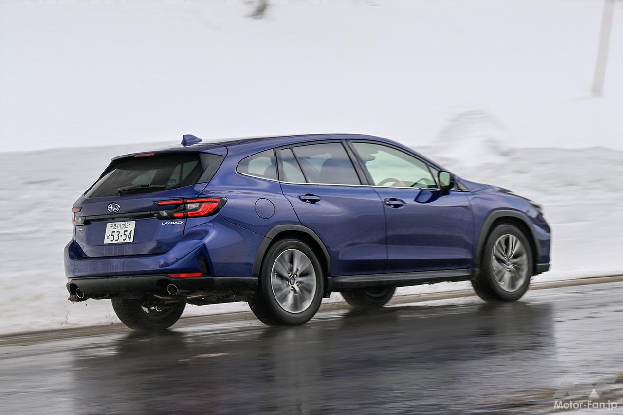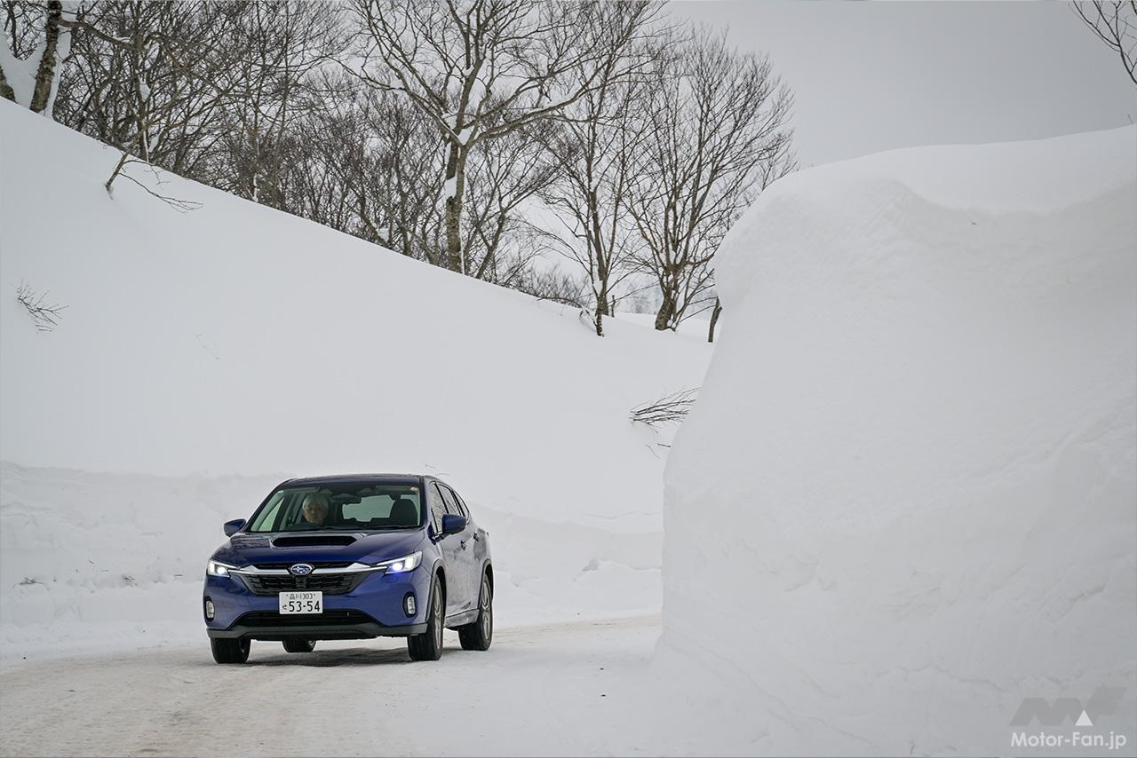 クロストレックと同じ200mmの最低地上高を持つスバル・レヴォーグ レイバック(以下レイバック)に雪深い酸ヶ湯温泉(青森県)周辺で乗った。もっとも、「雪深い」の形容は道路脇に限られる。道路上のアスファルトは完全に露出しており、軽く湿った状態だった。道路は除雪が行き届いており、アスファルト上の雪は温浴施設の駐車場や退避路に限られていた。