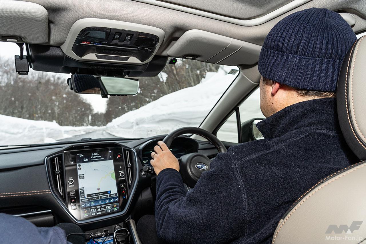 そう考えるとアイサイト様々である。フロントグリル、ドアミラー、リヤゲートに備えたカメラの画像をセンターディスプレイに表示するマルチビューモニターも、雪の壁で視界が遮られる状況では重宝する。交差点で直交する道路に鼻先を出すような状況では、フロントビューで左右の状況を確認することが可能。「VIEWスイッチ」はセレクターレバーの脇という押しやすい場所にあるのがいい。スイッチを押してAUTOモードを選択すると、車速が15km/h未満になった際に部分トップビュー+フロントビュー画面を自動的に表示するので便利だ。