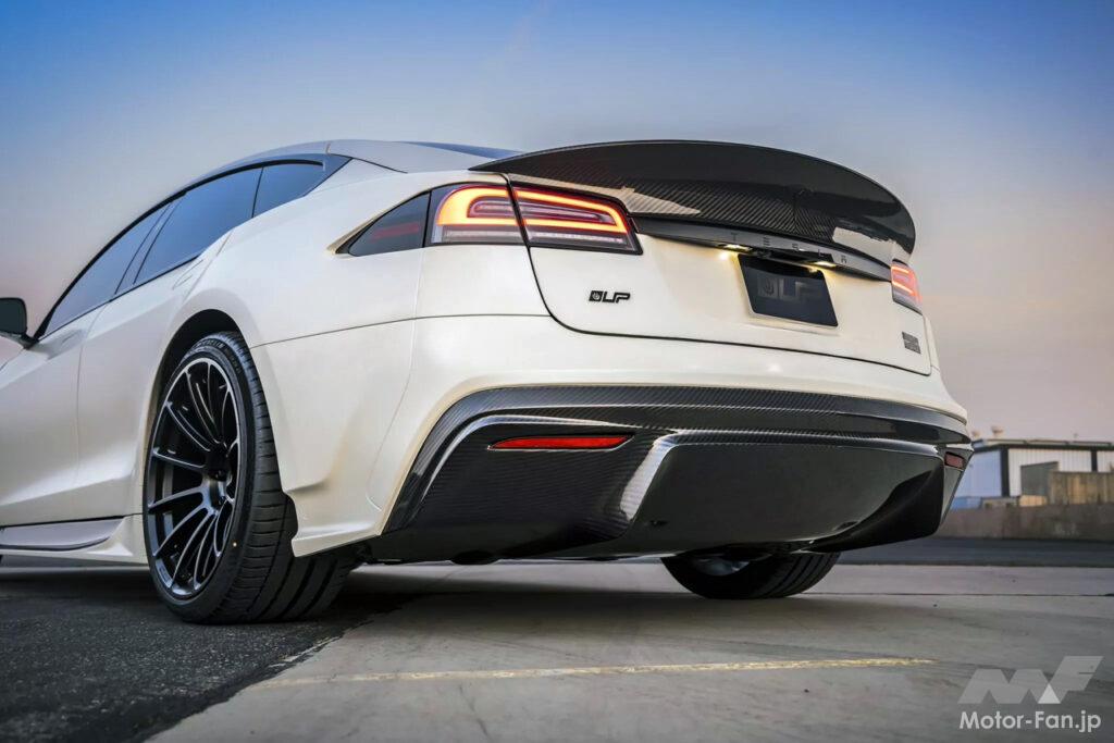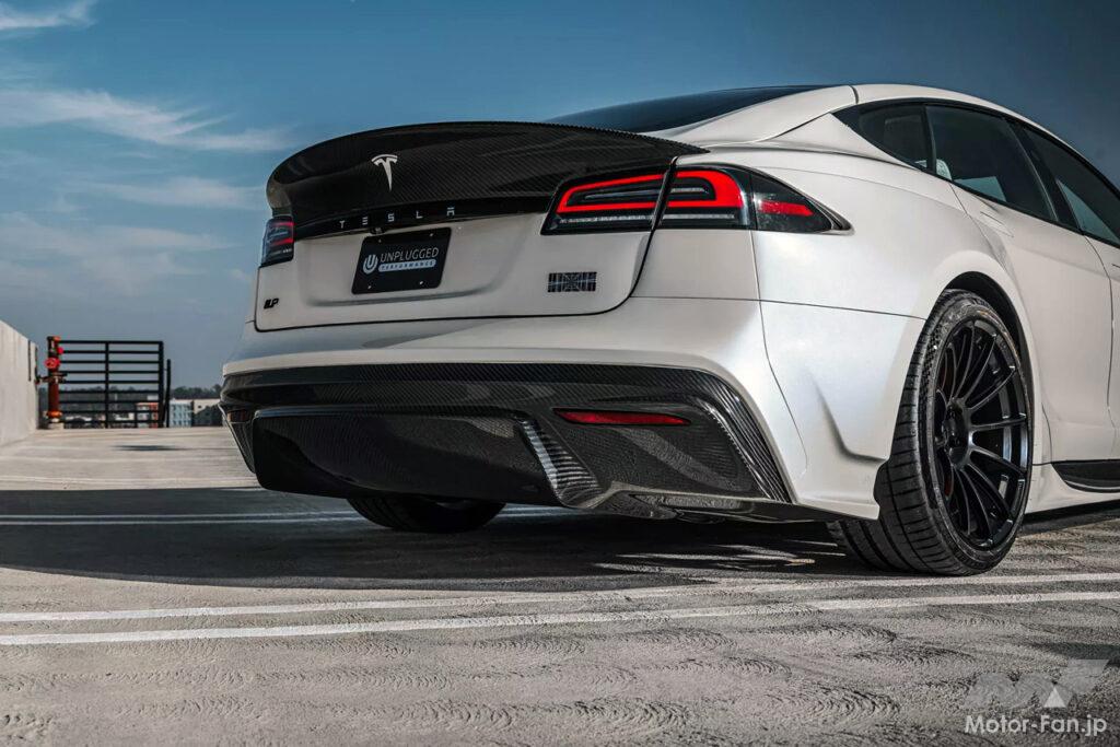 モデルSプラッドとすぐに区別できるのは、「S-Apex」と名付けられたカーボンファイバーワイドボディキットだ。このキットは、フレア・リヤホイールアーチを備え、プリプレグ・カーボンファイバー製の19ピースキットを装備、全幅が80mm(3.14インチ)広くなっている。このほか、前輪後ろのカーボンファイバー フィン、アグレッシブなカーボン・ディフューザーや、カーボン・リヤ・リップスポイラーが装備される。ボディは、ブルーがかったパールホワイトの美しい色合いに再塗装され、ペイント保護フィルムで覆われている。