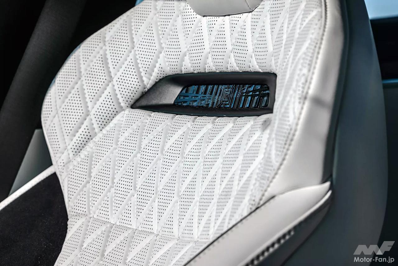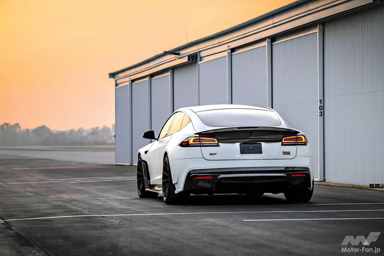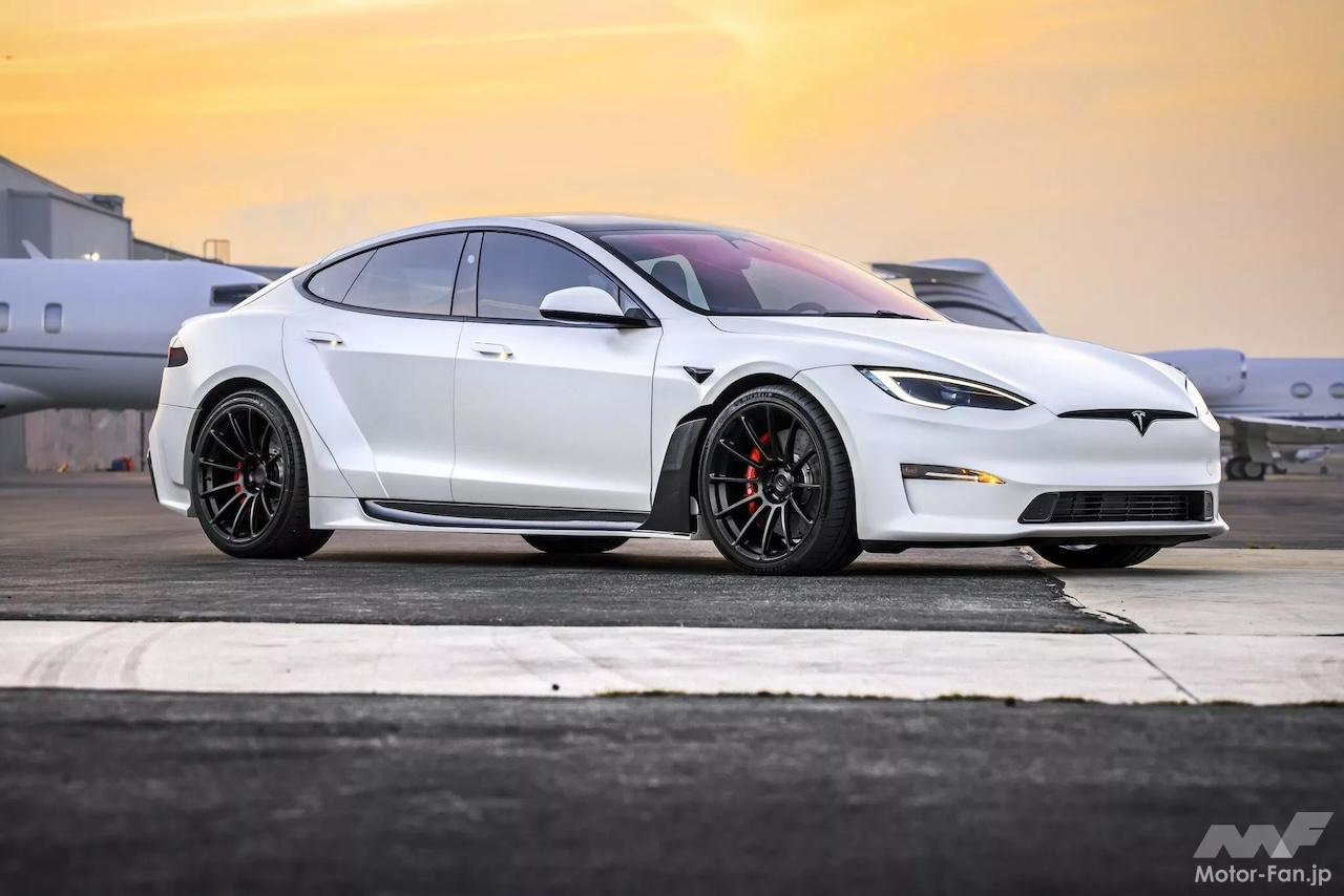 モデルSプラッドとすぐに区別できるのは、「S-Apex」と名付けられたカーボンファイバーワイドボディキットだ。このキットは、フレア・リヤホイールアーチを備え、プリプレグ・カーボンファイバー製の19ピースキットを装備、全幅が80mm(3.14インチ)広くなっている。このほか、前輪後ろのカーボンファイバー フィン、アグレッシブなカーボン・ディフューザーや、カーボン・リヤ・リップスポイラーが装備される。ボディは、ブルーがかったパールホワイトの美しい色合いに再塗装され、ペイント保護フィルムで覆われている。