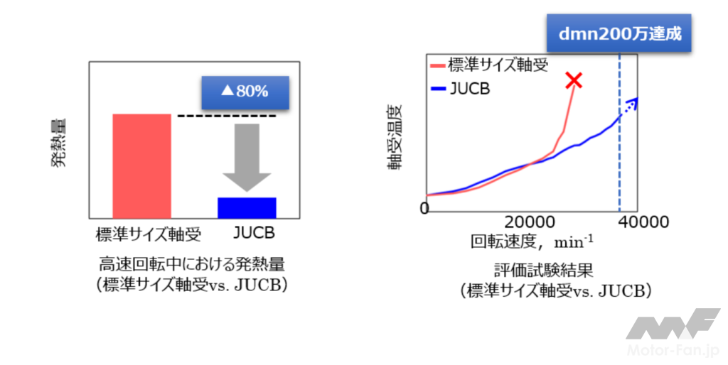 実際に軸受を高速回転させる評価試験において、JUCBは標準サイズ軸受よりも高速回転時の温度上昇を抑制することができ、世界最速レベルのdmn200万の高速性能が実現された。本結果により、JUCBはeAxleをはじめとした幅広い駆動ユニットの小型化・軽量化への貢献が期待されている。