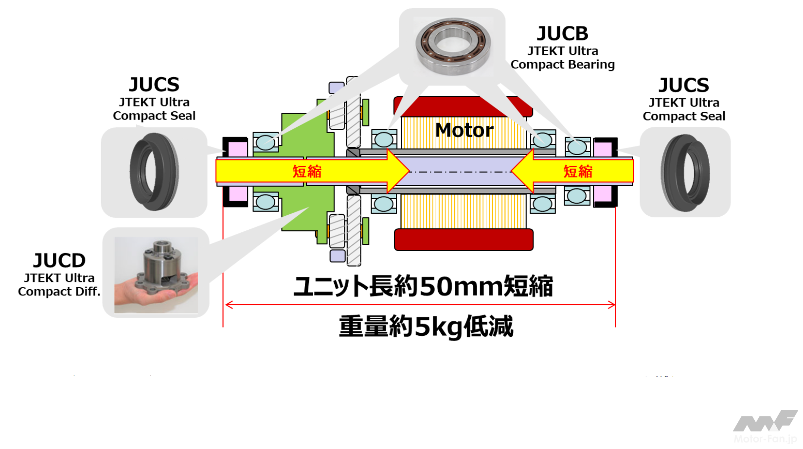 今後はJUCBのみならず、発表済みのJTEKT Ultra Compact Diff.(JUCD)やJTEKT Ultra Compact Seal(JUCS)といった、ジェイテクトが有する技術によって顧客に電動化貢献技術が提供される。上述3製品を、BEV電動駆動システムで特に需要拡大が予測される出力150Kwの同軸タイプeAxleに適用した場合、eAxleのユニット長を約50mm短縮、重量を約5kg低減すると算出され、eAxleの幅寸法短縮をはじめ、前後寸法や高さ寸法の短縮、それらに伴う小型化・軽量化への貢献が期待されている。
