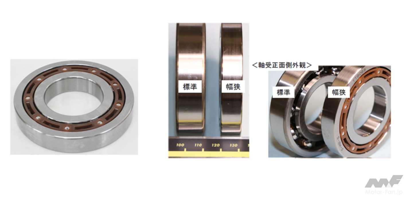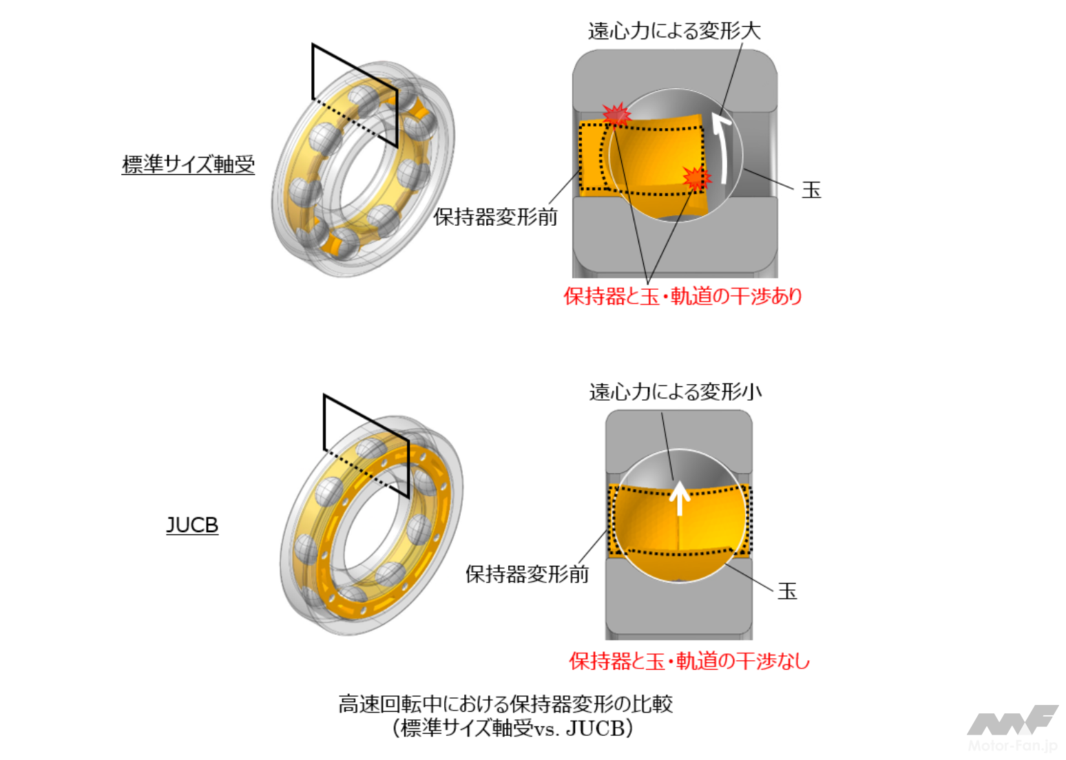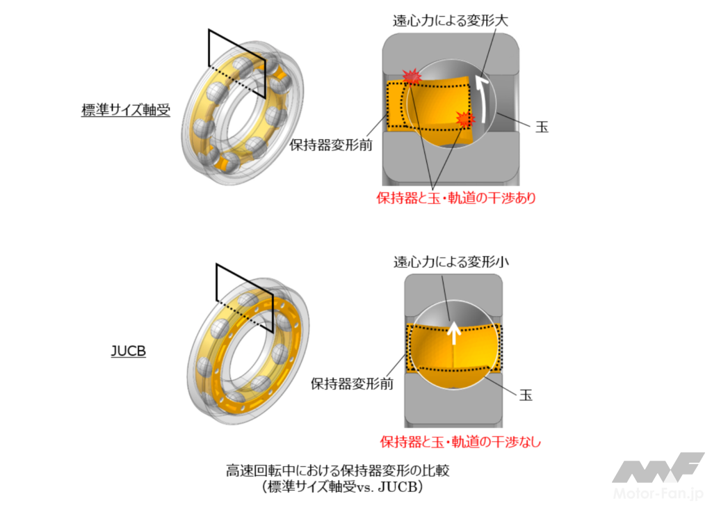 高速回転で軸受を使用する場合、大きな遠心力や玉の進み遅れによる影響で、保持器の破損や軸受内部の急激な温度上昇が懸念される。ジェイテクトでは、MBD技術によって高速回転中における軸受内部の負荷状態と温度分布を予測し、耐久性を担保しながら昇温を抑制することができるバランス設計が実現された。従来の標準サイズ軸受の冠形保持器に対して、合わせタイプにすることによって非常に小さな断面積ながら遠心力による保持器の変形を抑制することが可能となり、保持器と他部品との接触による発熱量を従来比で80%削減できることが確認された。通常、高速回転用軸受の保持器には、剛性や耐熱性、耐久性に優れる高価な樹脂材料を採用する必要があるが、開発品では保持器材料の変更を行うことなく、省スペース化と高速化の同時実現に目途が立てられた。