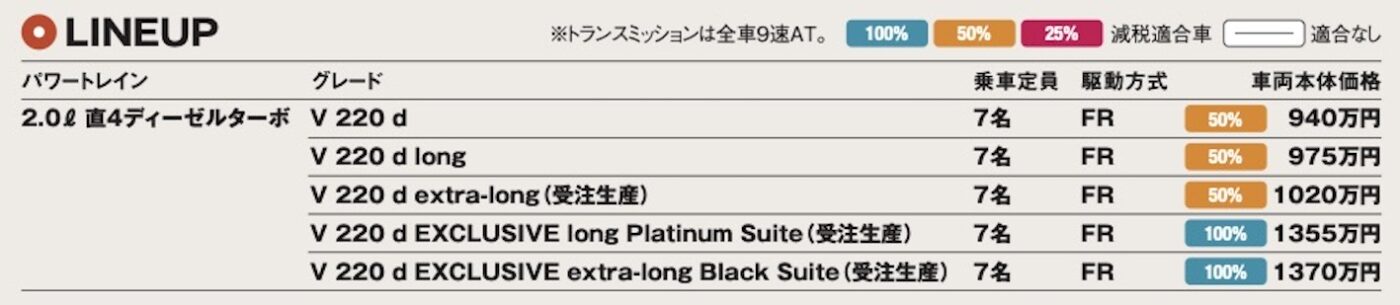 対話型インフォテインメントシステムの「MBUX」のような装備をいちはやく導入した点も特徴だ。デビュー当初はベースが商用車である面影がそこはかとなく感じられたものだが、時間の経過とともに高級ミニバンとしての価値を高めてきた。最も販売比率の高い「ロング」のほかに、ホイールベースが同じでリヤオーバーハングが245㎜短い標準仕様と、ホイールベースが230㎜長い「エクストラロング」が用意されている(一部受注生産)。日本向けはすべて7名乗りで、2列目に3点式シートベルト一体型のキャプテンシートが備わる。
